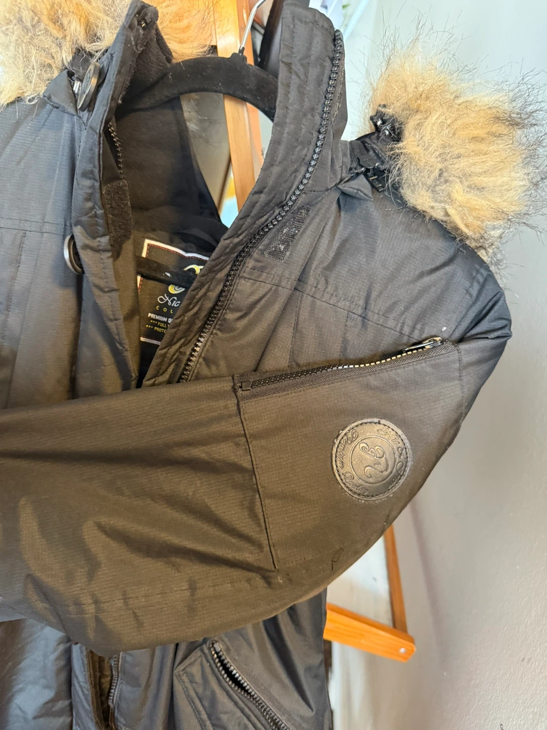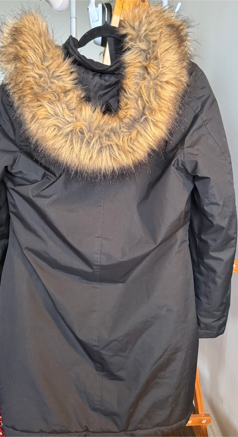 Warm black winter parka with a cozy insulated interior and faux-fur trimmed hood. Features a full button and zipper closure, multiple pockets, and a longer length for extra warmth. Made from durable polyester fabric, designed for cold weather protection.