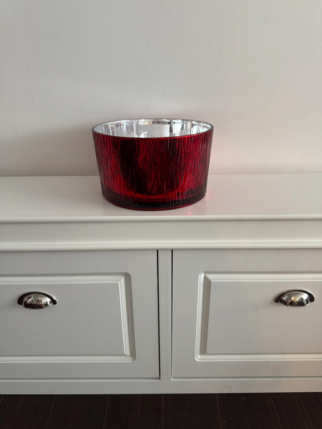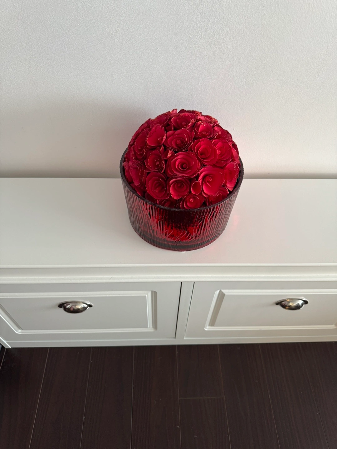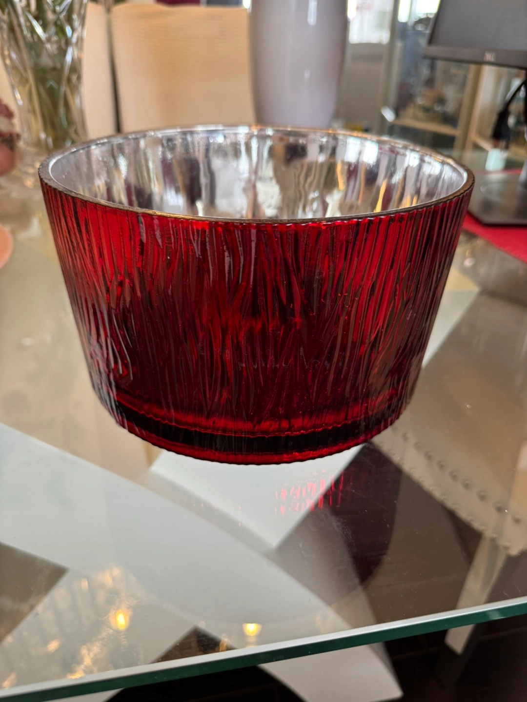 Beautiful red glass bowl. Perfect for displaying flowers or other decorative items. Features a textured exterior and a shiny interior. Flowers not included but if you want to buy it , i can sell it . Pick up at Bathurst/Steeles area.