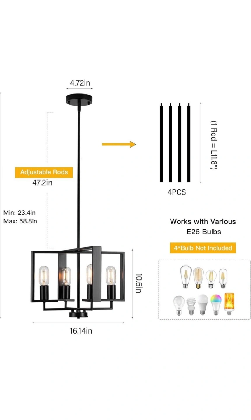 E26 Bulb & Materials: This black farmhouse chandeliers compatible with E26*4 bulbs (not included).Rustic kitchen chandelier maded of high-quality metal materials, durable and long-lasting metal that is rust and scratch resistant.