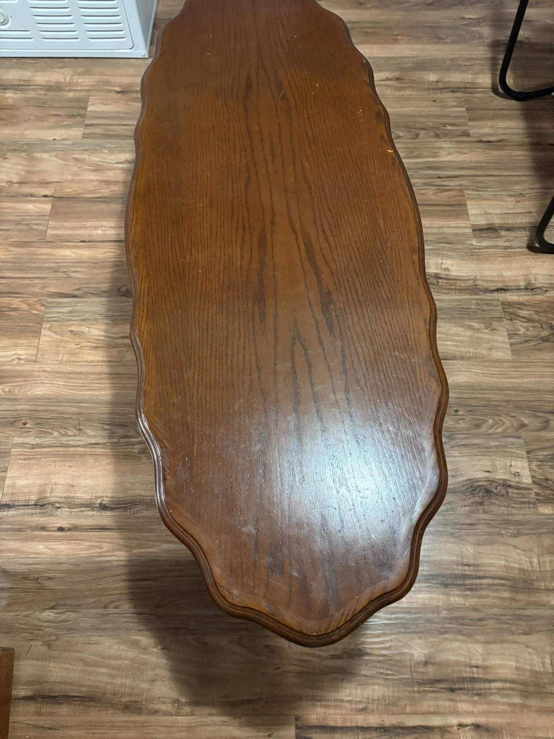 This is a classic wooden coffee table with intricate carved detailing along the apron. Its dark wood finish and unique shape add a touch of vintage charm to any living space. It's sturdy and ready for a new home! Pet free, smoke free, cash only