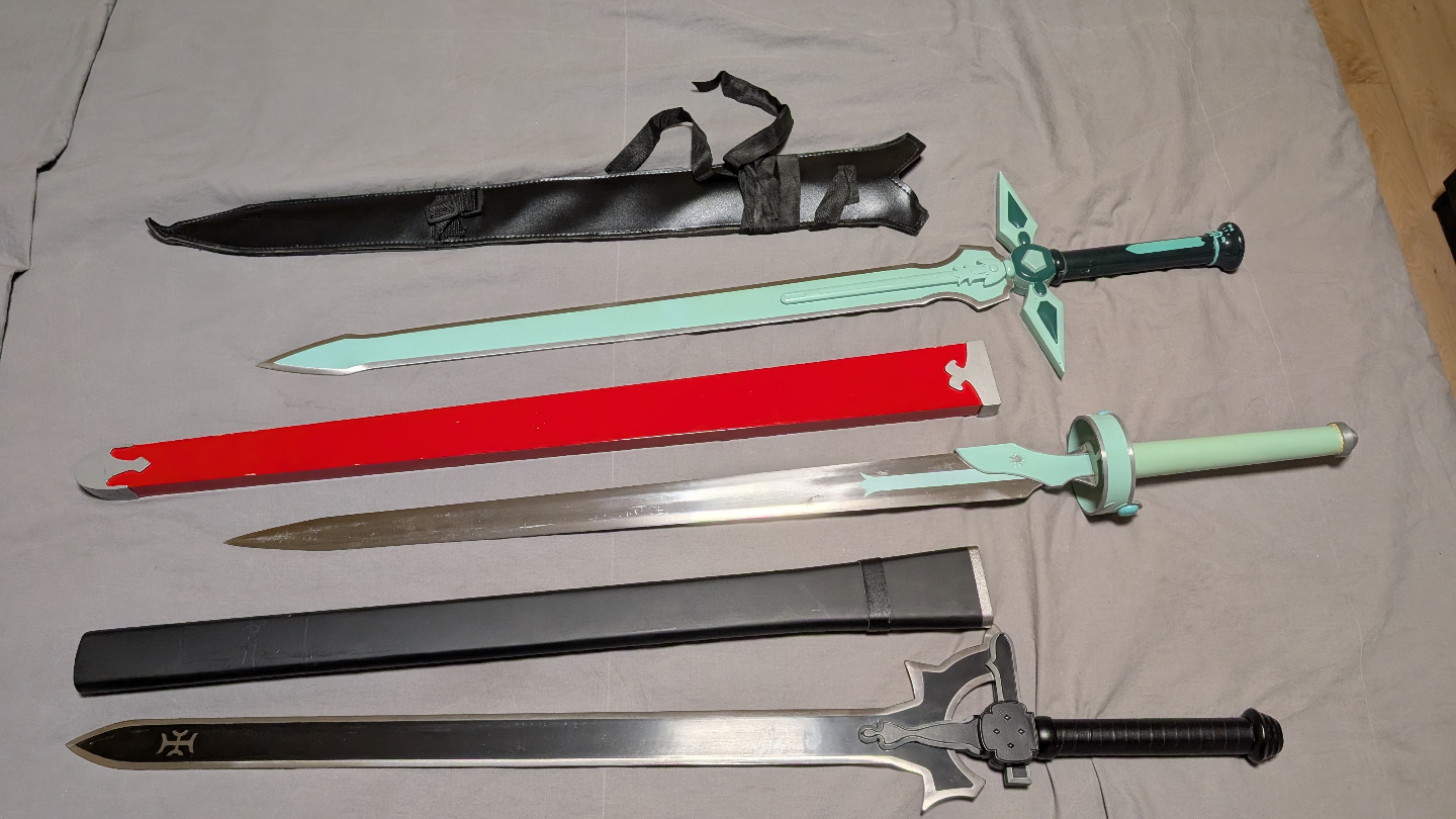 Three replica swords from Sword Art Online. Includes sheaths. Great for cosplay or collection. $50 each and cash only please