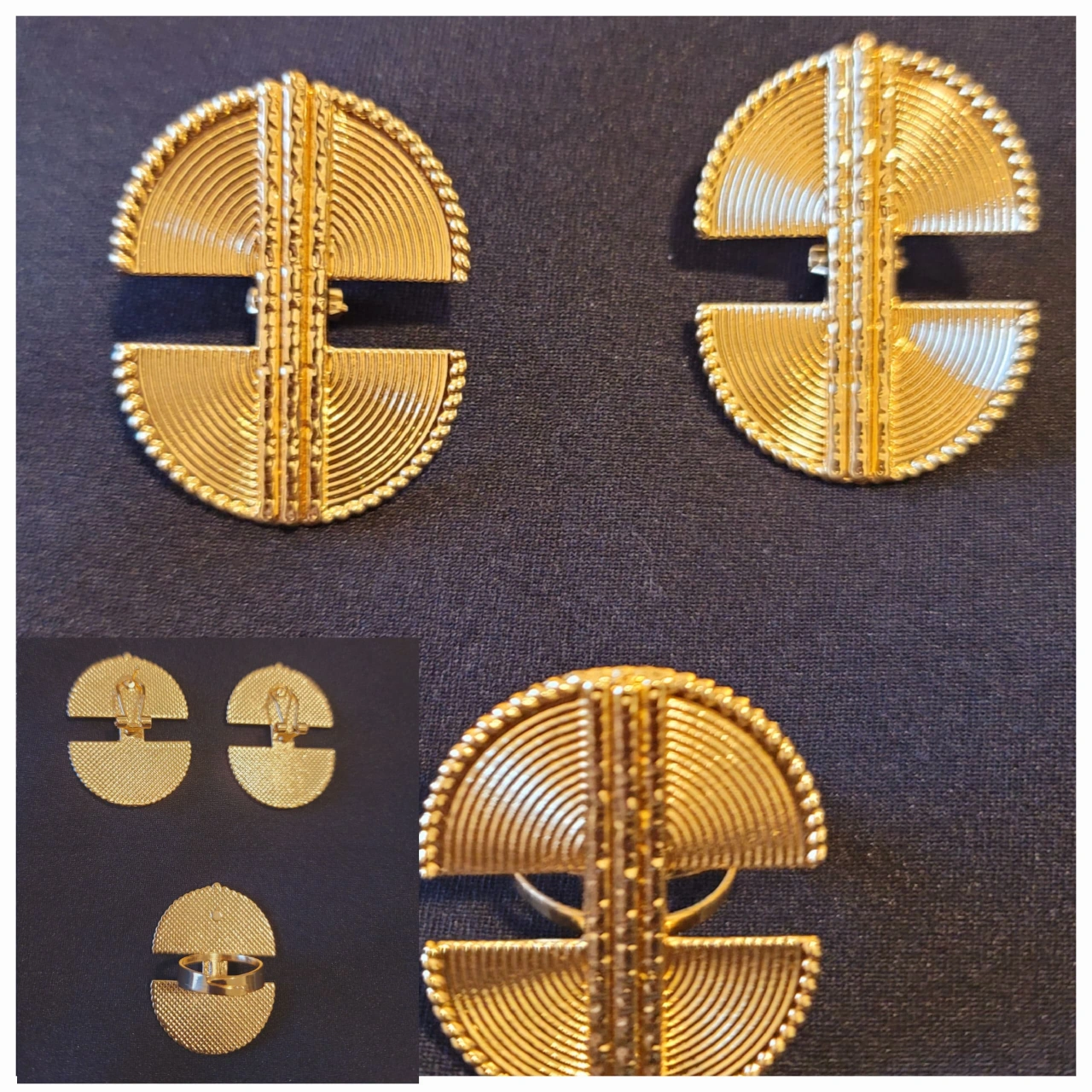 This set includes an adjustable ring and a pair of earrings. The ring has a wide band with a unique design, and the earrings are designed to match.