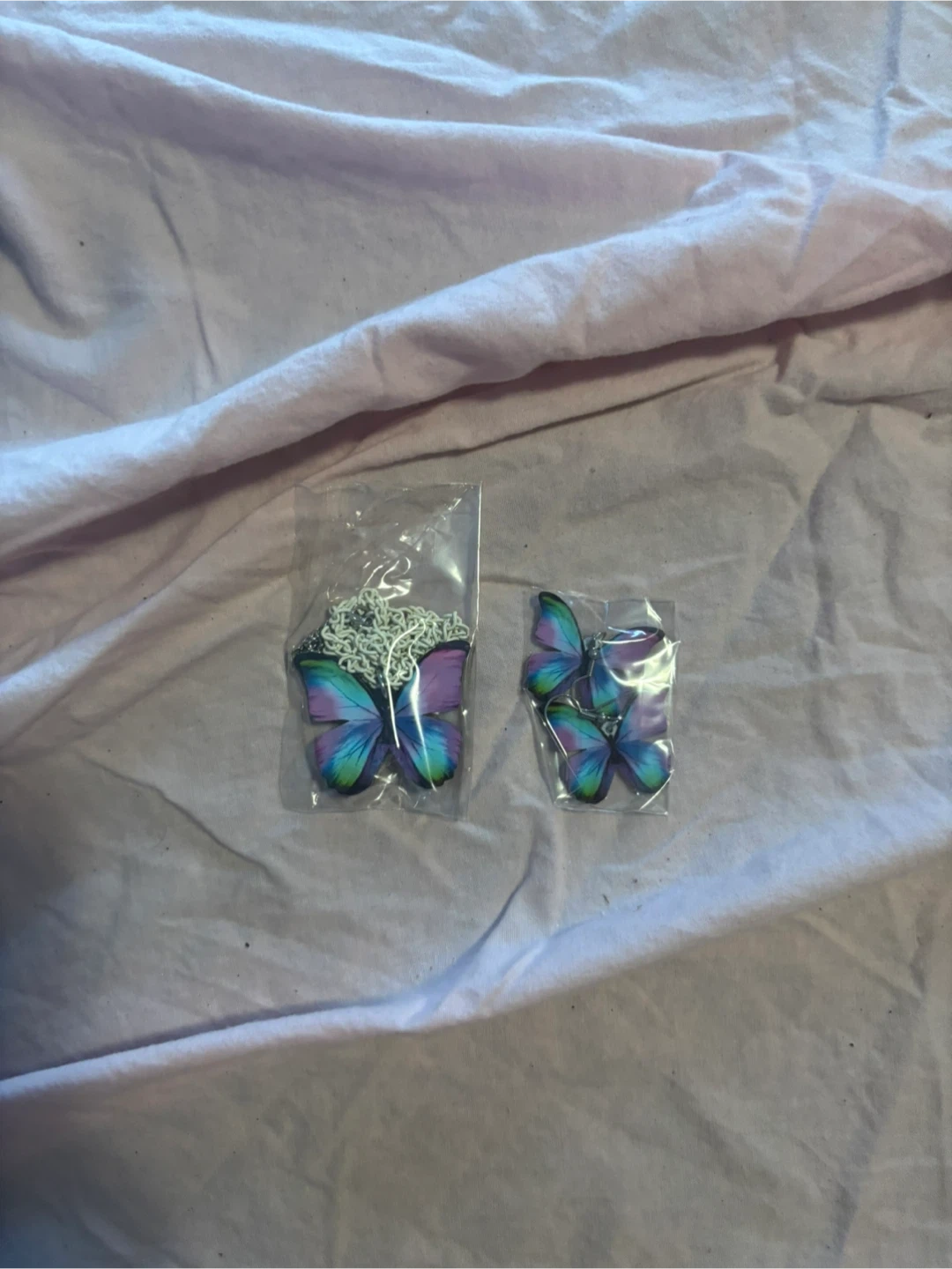 Selling a brand new butterfly necklace and earrings set! The set features a beautiful blue and purple butterfly design. The necklace comes with a silver chain. Perfect for adding a touch of whimsy to any outfit!