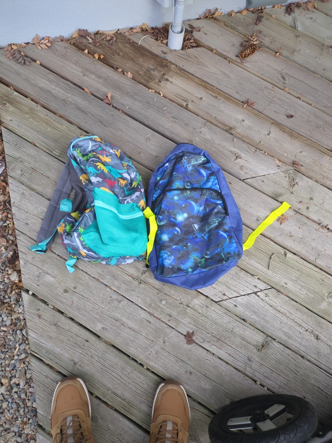 Two cool backpacks for kids, one with a fun dinosaur print and the other with a vibrant space theme. They're great for school or day trips!