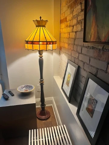 This floor lamp features a stained glass shade with amber and brown tones. It's mounted on a dark wood-toned pedestal base. Adds a warm glow to any room!
