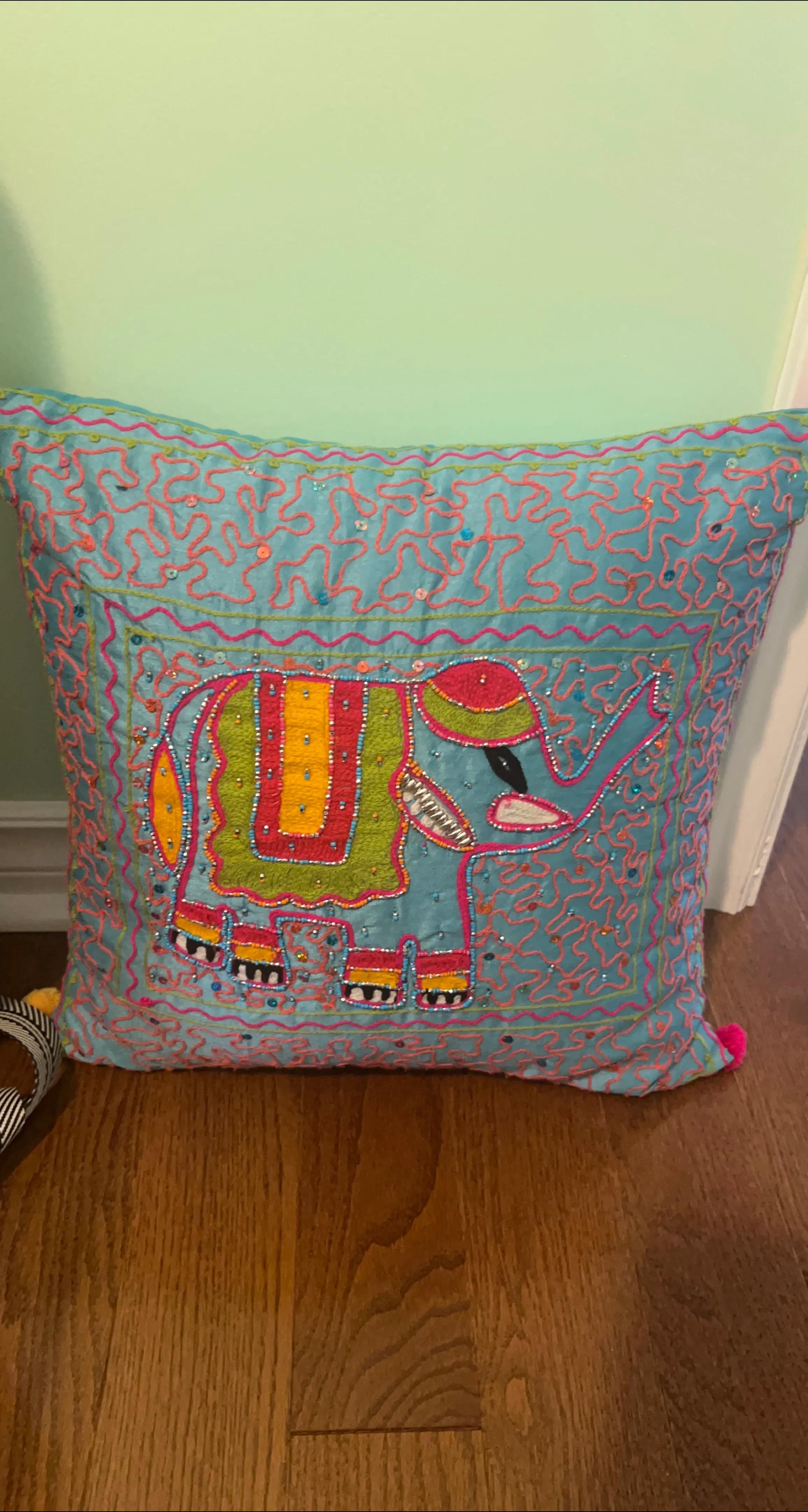 A vibrant blue pillow featuring an embroidered and sequined elephant design. It's embellished with colourful threads and beads, adding a pop of colour to any space. Measures approximately 16x16 inches.