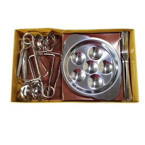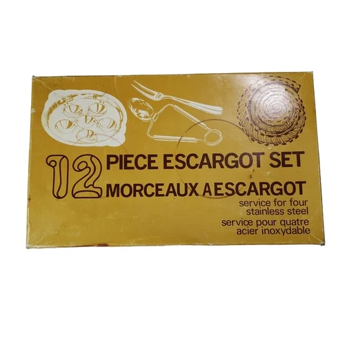 Vintage set for preparing escargots. Includes 4 stainless steel plates, 4 tongs, and 18/8 INOX forks. Let me know if you're interested!