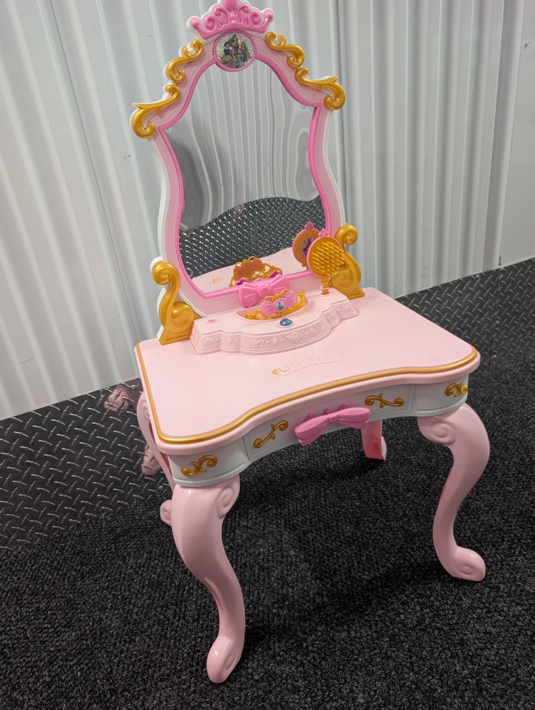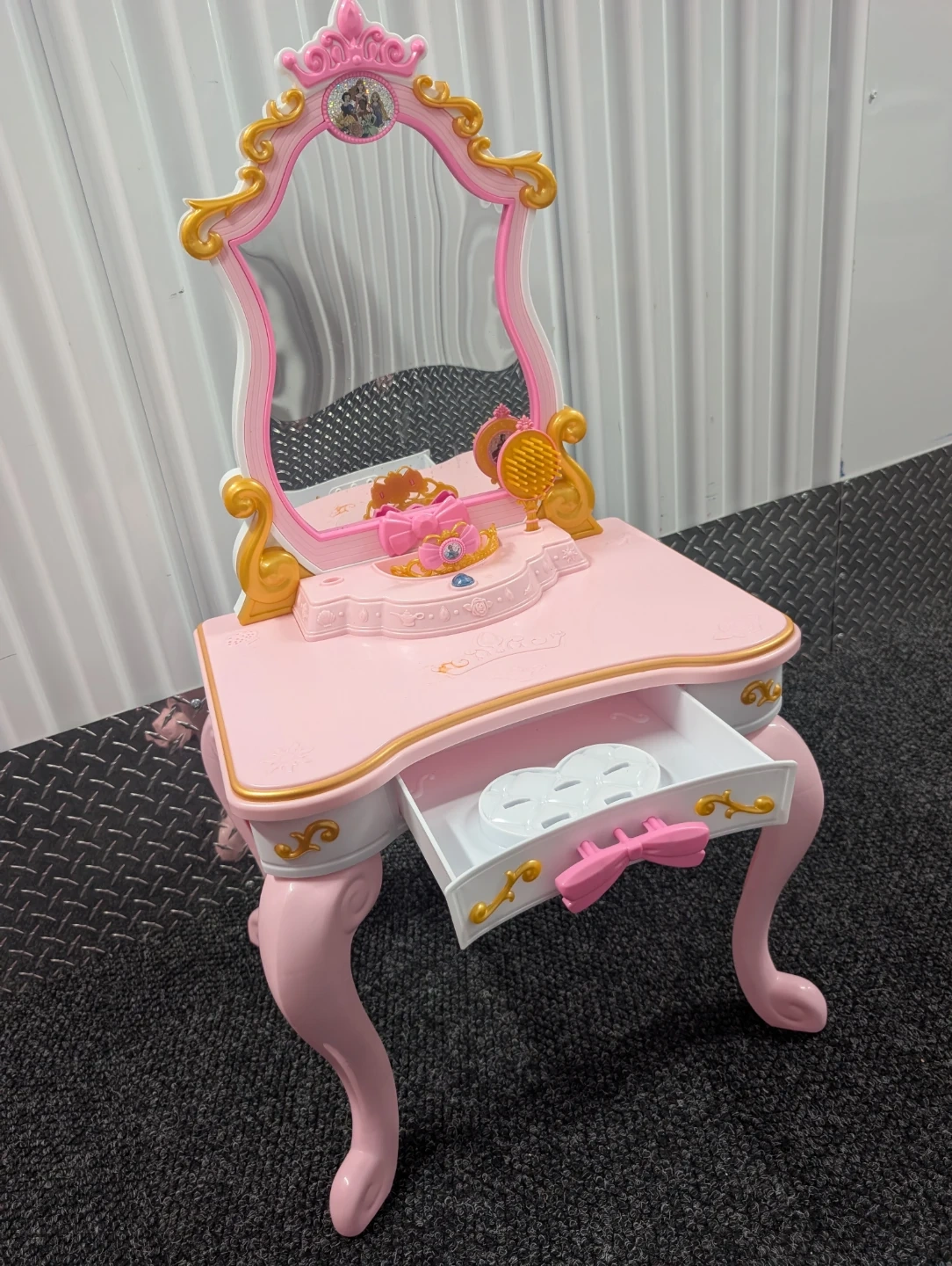 This is a pink play vanity table with a mirror and accessories. It features a drawer for storage and decorative gold trim. Includes a comb, brush, and tiara accessory.