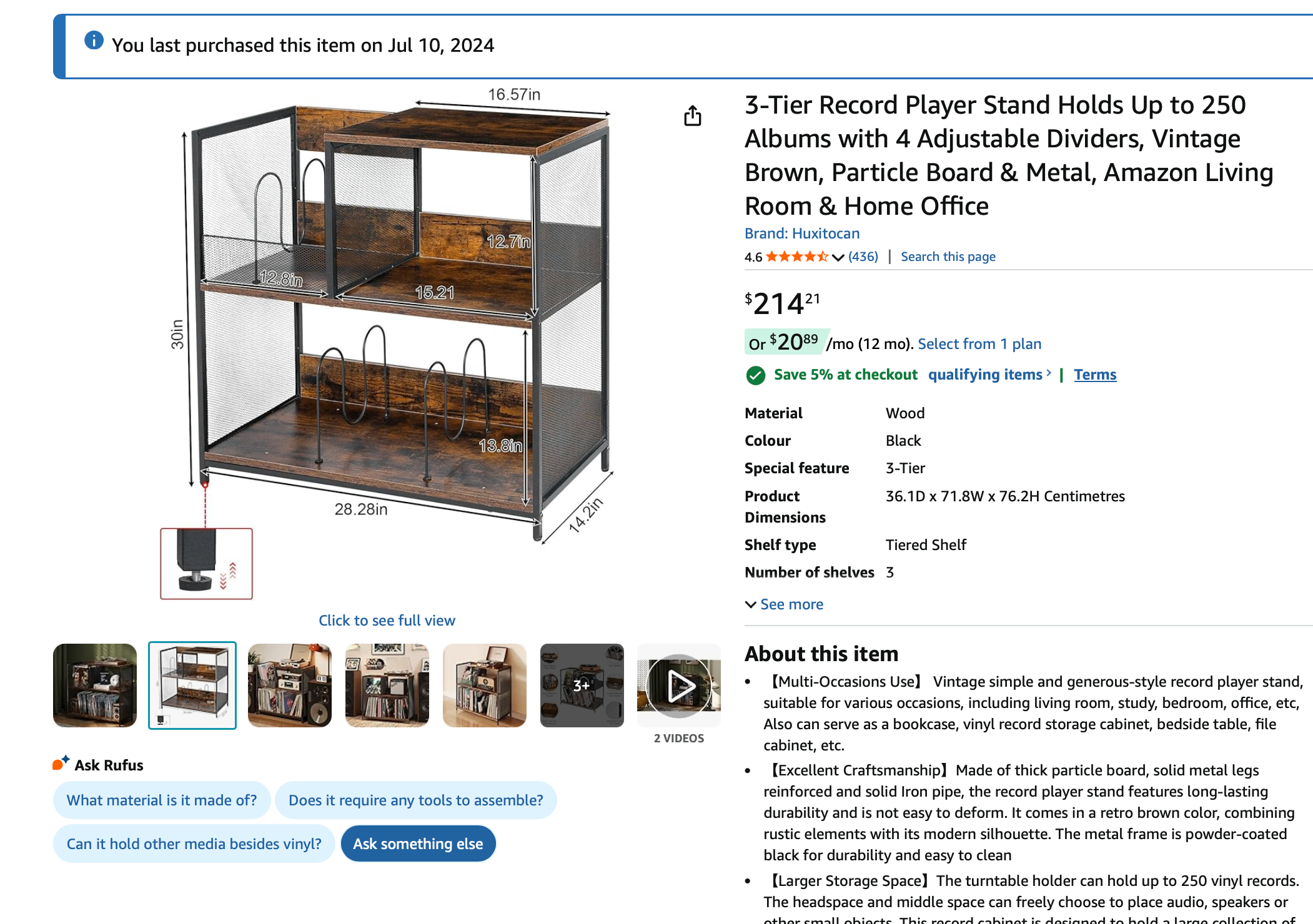 3-Tier Record Player Stand Holds Up to 250 Albums with 4 Adjustable Dividers, Vintage Brown