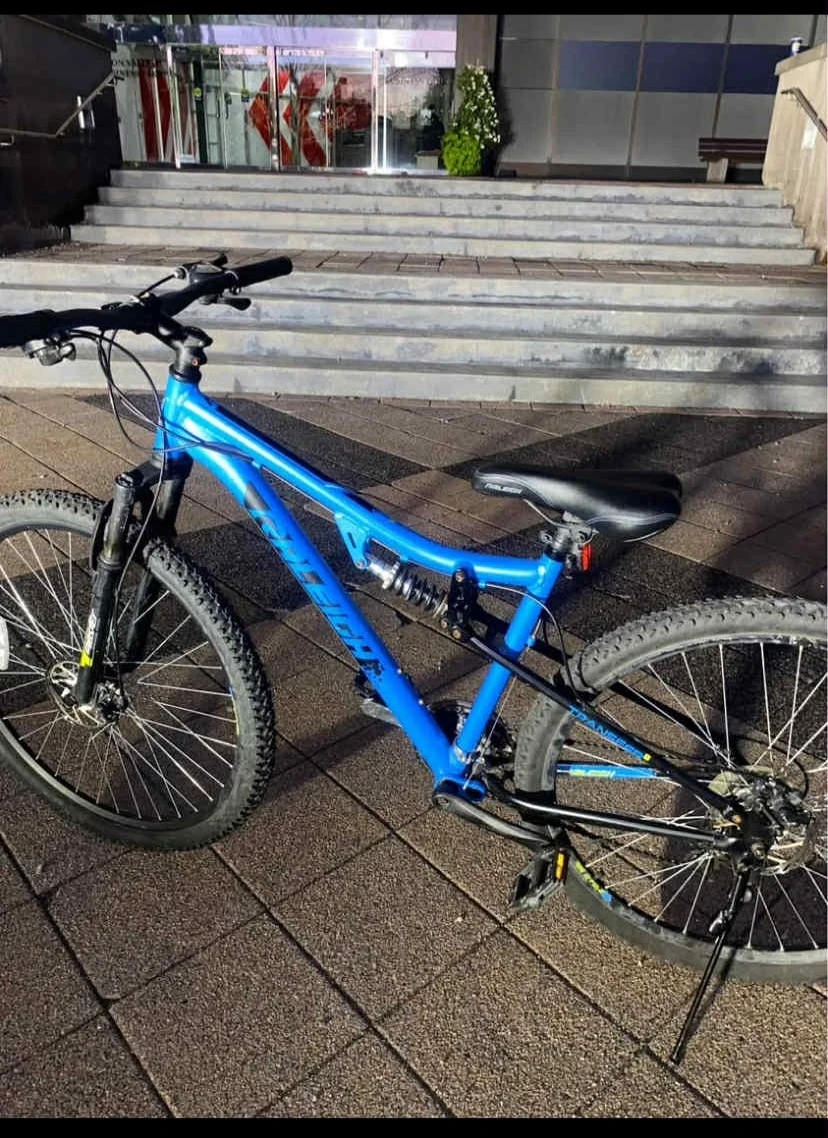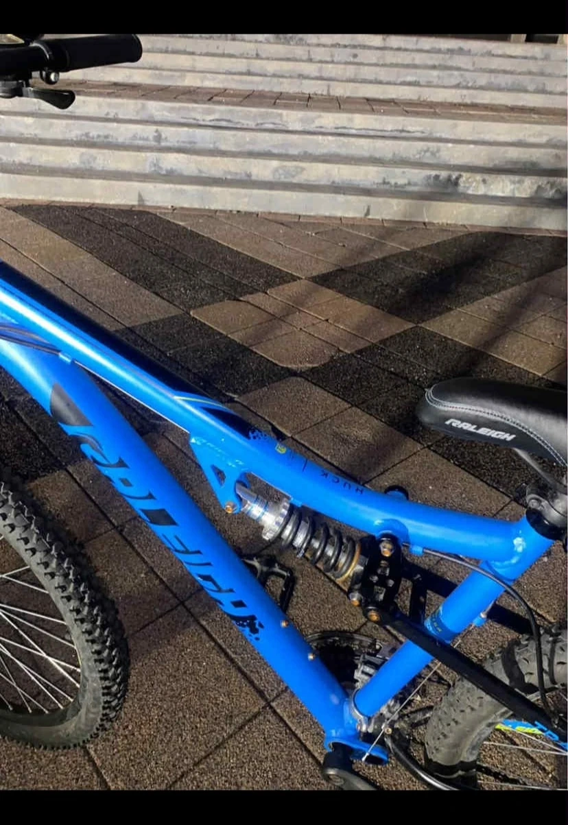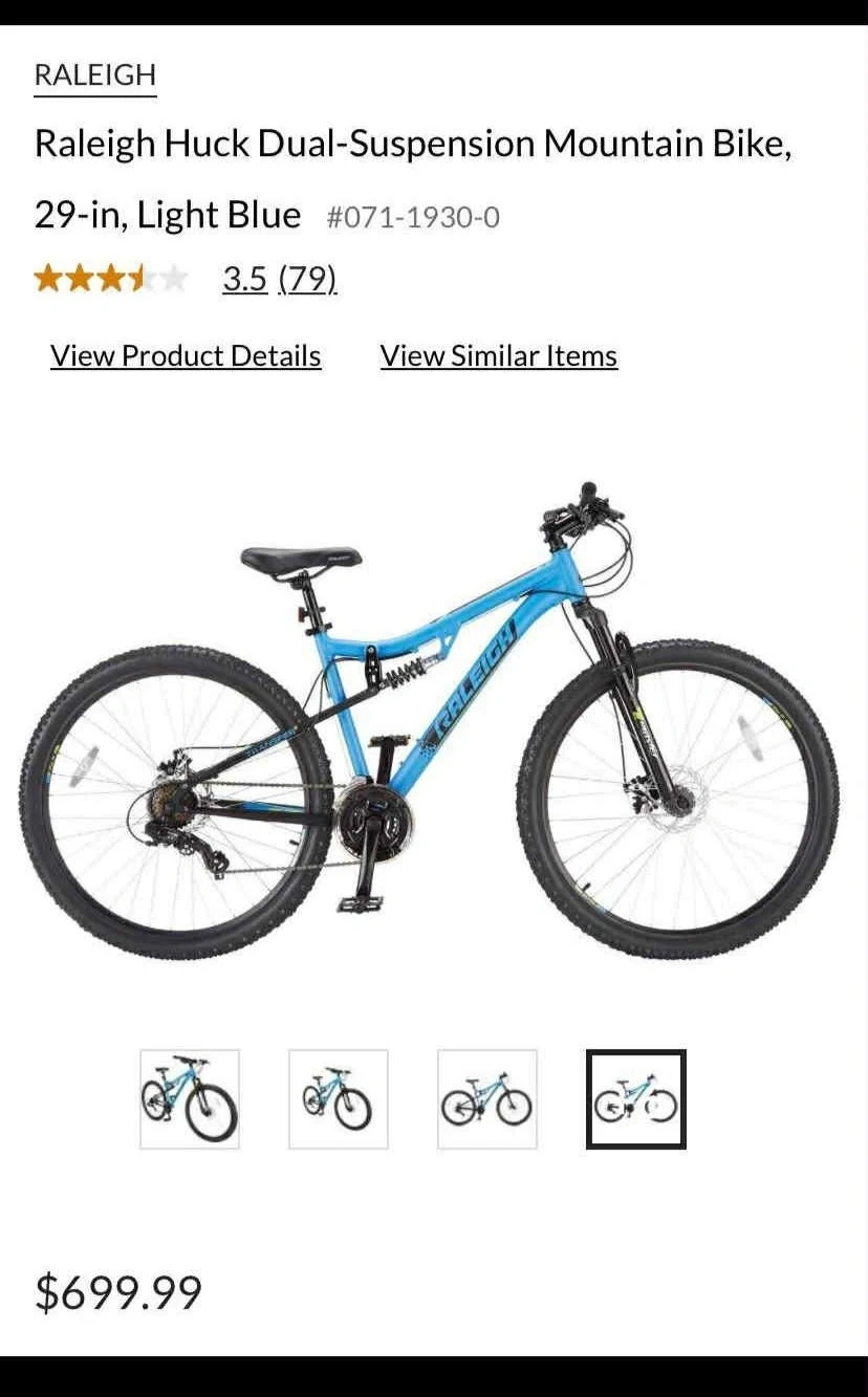 Selling a Raleigh Huck dual-suspension mountain bike in light blue. It's a 29-inch bike, perfect for hitting the trails or cruising around town. Retails for $699.99.