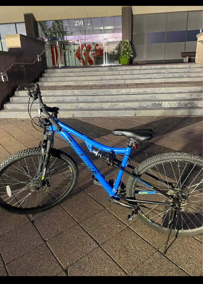 Selling a Raleigh Huck dual-suspension mountain bike in light blue. It's a 29-inch bike, perfect for hitting the trails or cruising around town. Retails for $699.99.