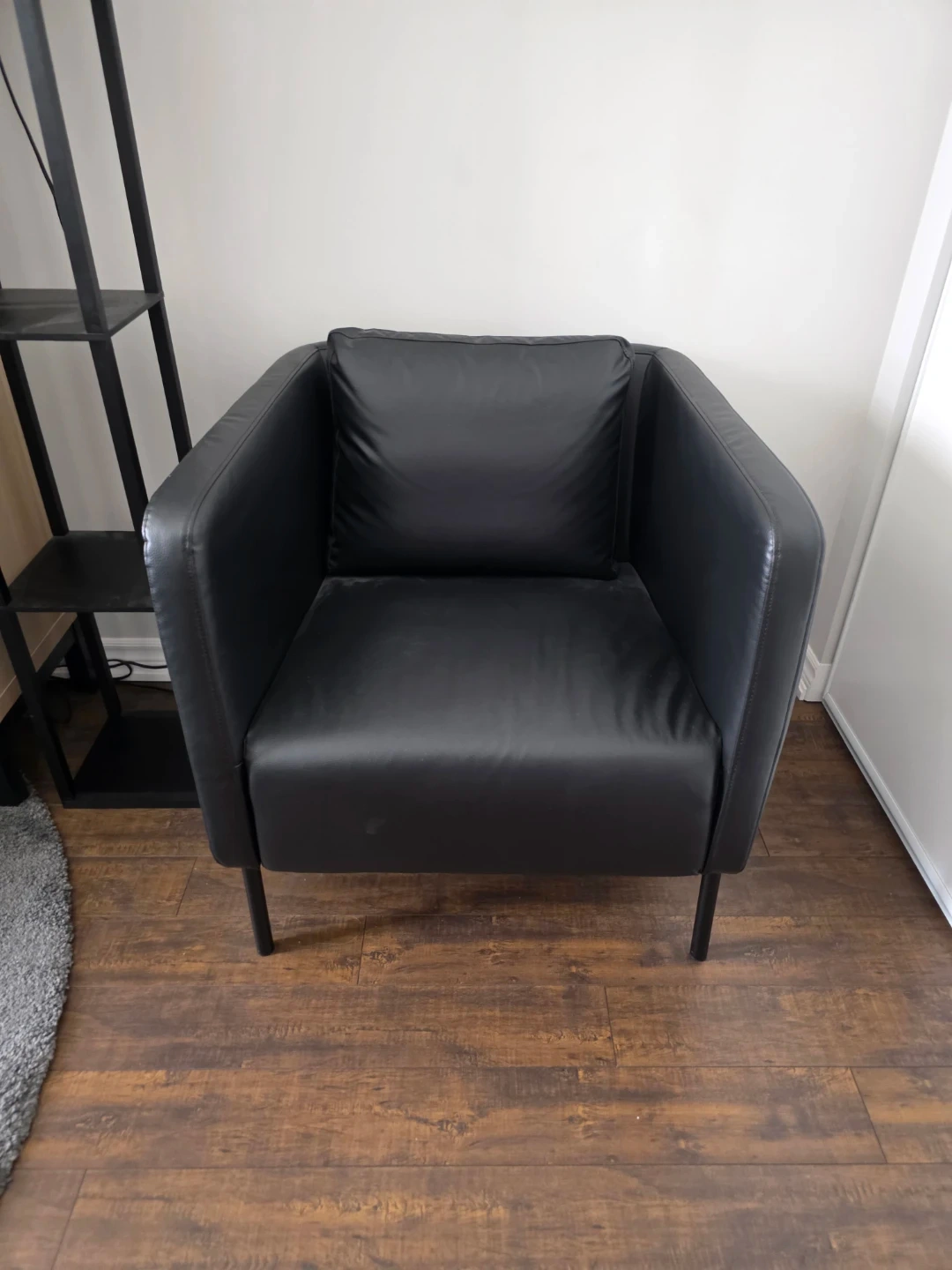 This is a sleek black faux leather armchair. It features a comfortable seat cushion and armrests. It's a stylish addition to any living space. Purchased from Ikea for $249 + HST