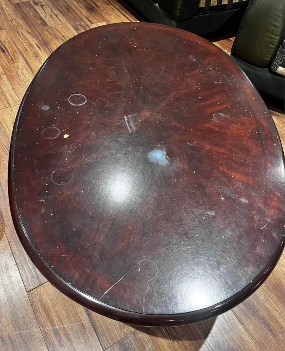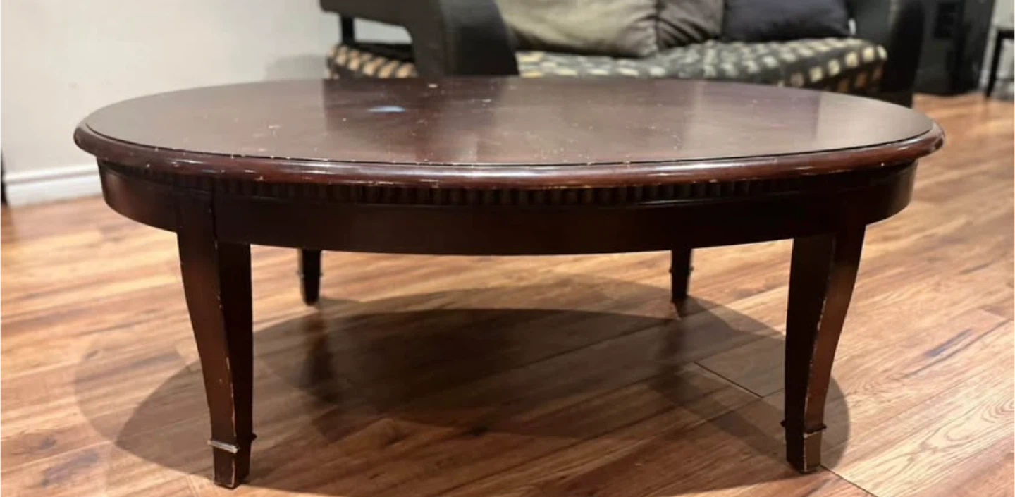 Selling a dark wood coffee table. It has some signs of wear and tear, as shown in the photos, but still has plenty of life left in it! Is in solid condition 100% wood