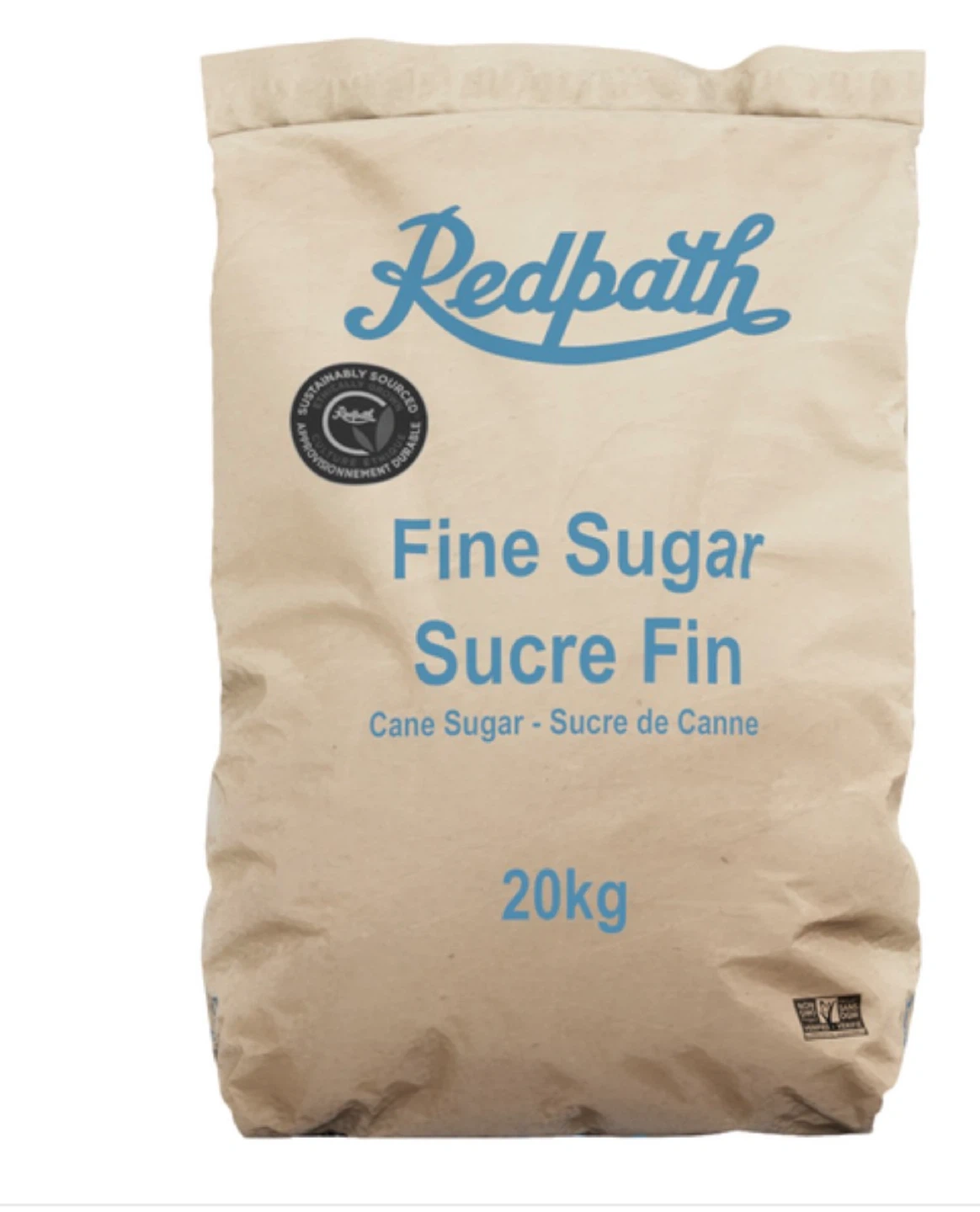 This is a 20kg bag of Redpath fine cane sugar. It's made from pure cane sugar. This bag is great for baking and cooking needs!