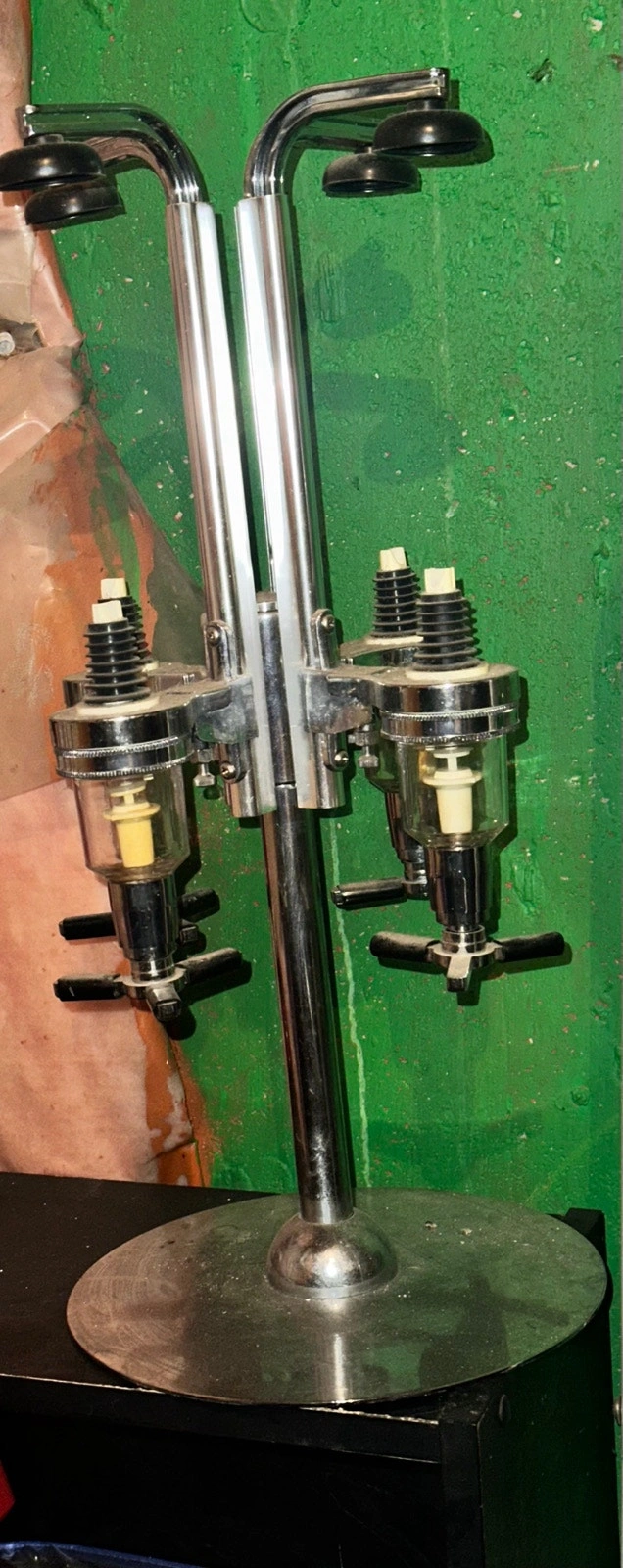 This used double liquor dispenser is perfect for any home bar setup, allowing you to accurately measure and dispense your favourite spirits with ease. This dispenser is in good condition. It features a chrome finish and a base stand. Priced to sell. If the ad is up, it's available. $75 OBO. Cash accepted.