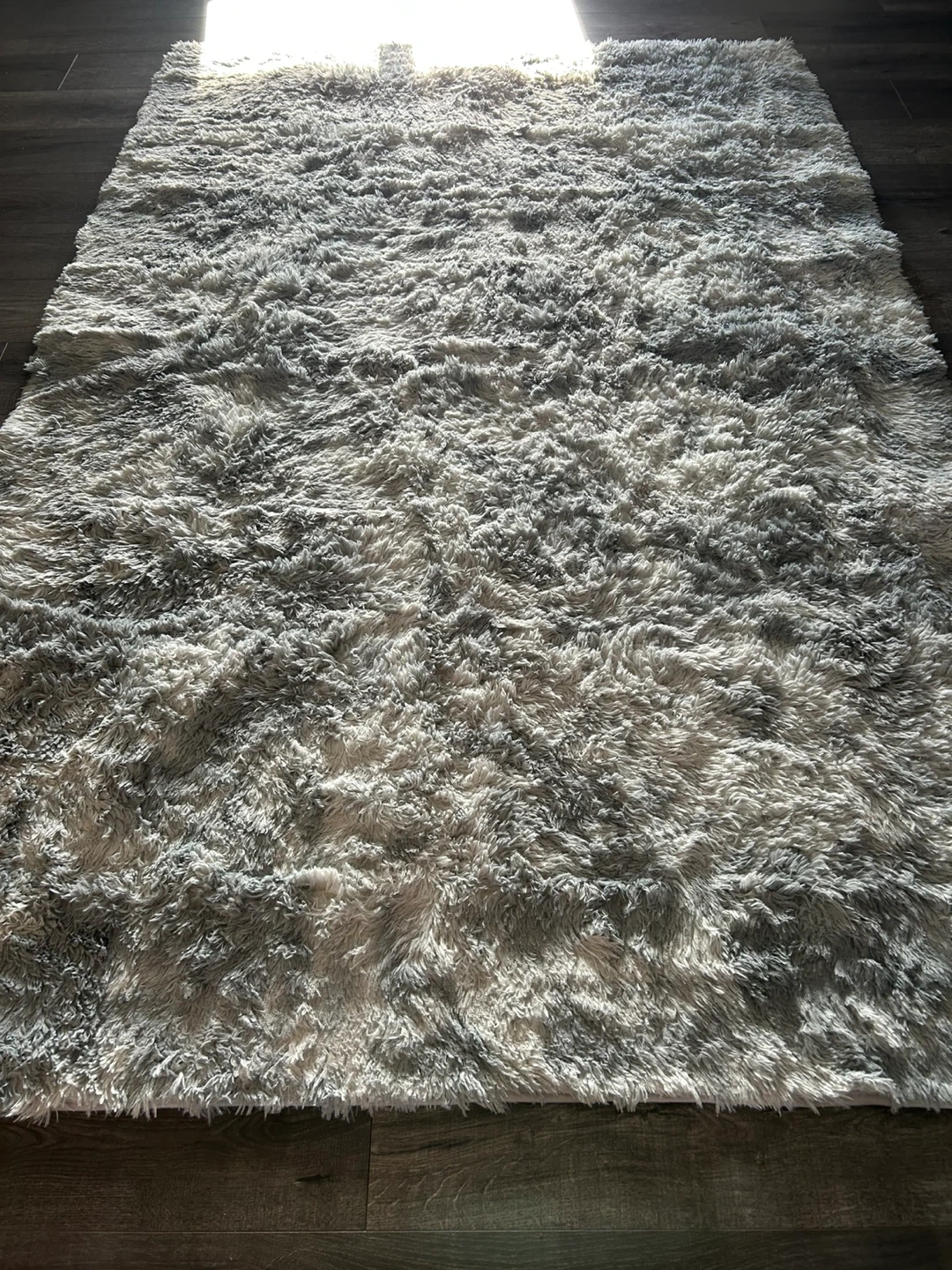 Selling a 8’x5’shaggy area rug in grey and white. It's in great condition and would look great in any room! The rug is soft and comfortable underfoot, adding a cozy touch to your space