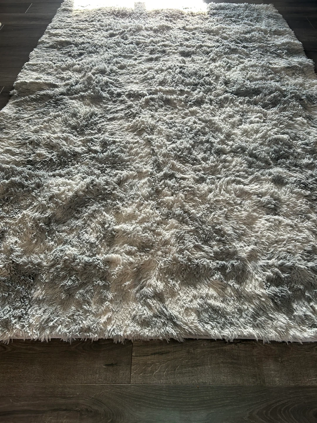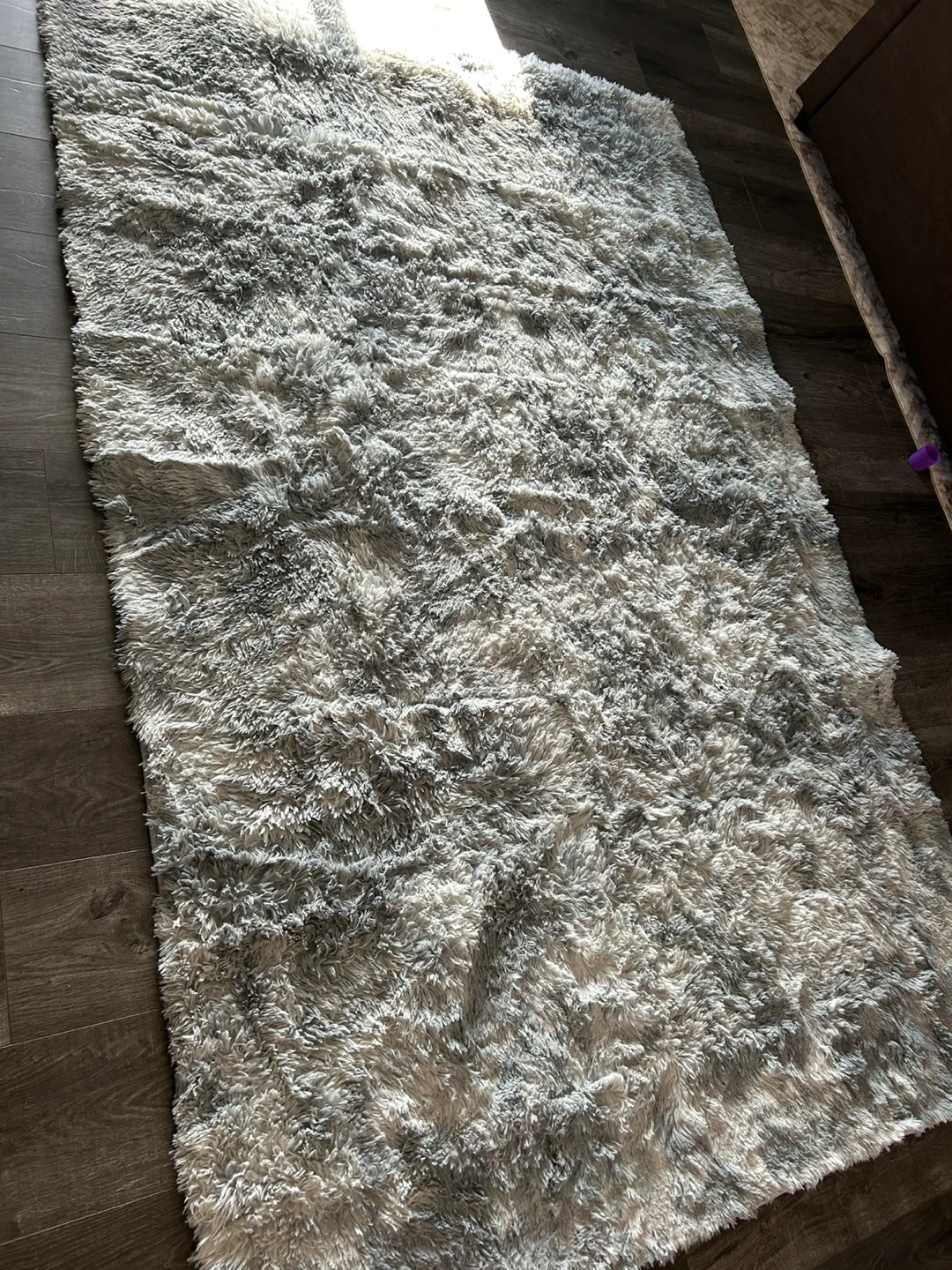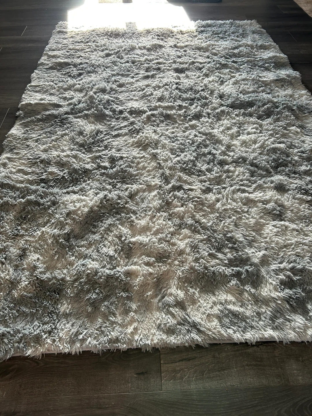 Selling a 8’x5’shaggy area rug in grey and white. It's in great condition and would look great in any room! The rug is soft and comfortable underfoot, adding a cozy touch to your space