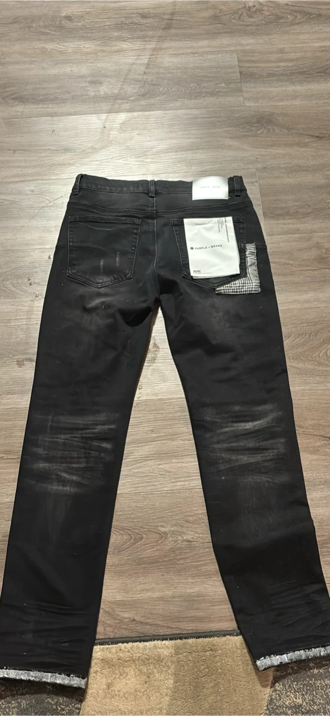 These are stylish black jeans from Purple Brand. They feature a distressed look with rips and patches. The leg opening has a unique frayed and patched finish. This denim is made for a modern look.