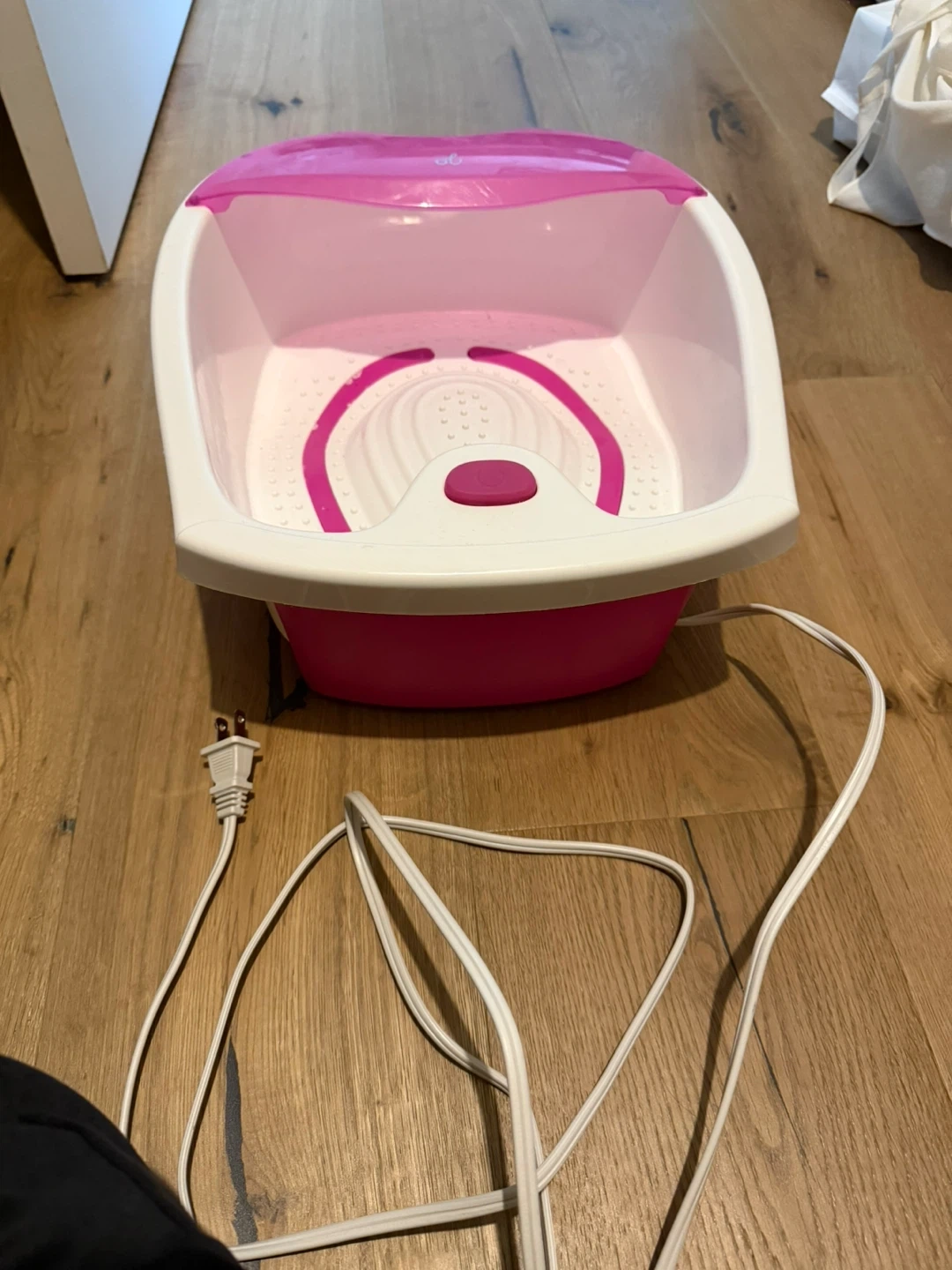 Electric foot spa bath with a pink and white design. relaxing foot soak experience. This spa is designed to soothe tired feet after a long day.