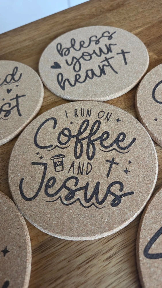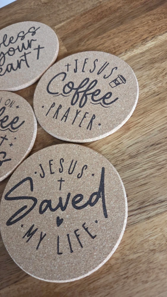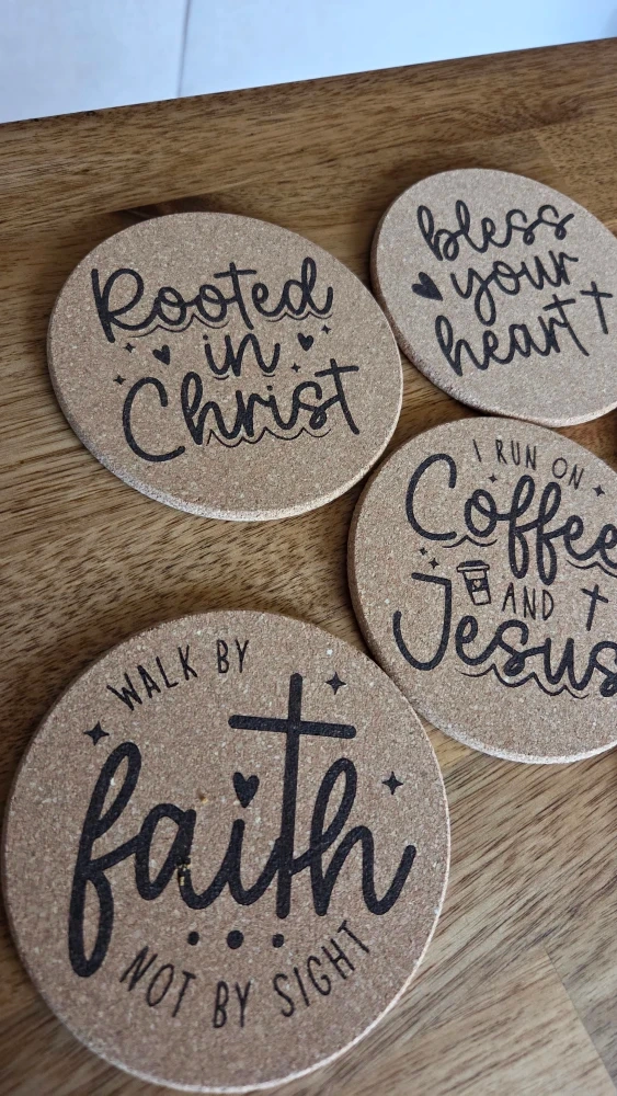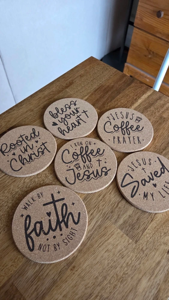 Brand new set of 6 Christian-themed cork coasters – perfect for your coffee table, home décor, or as a meaningful gift. Each coaster features a beautiful faith-inspired message.