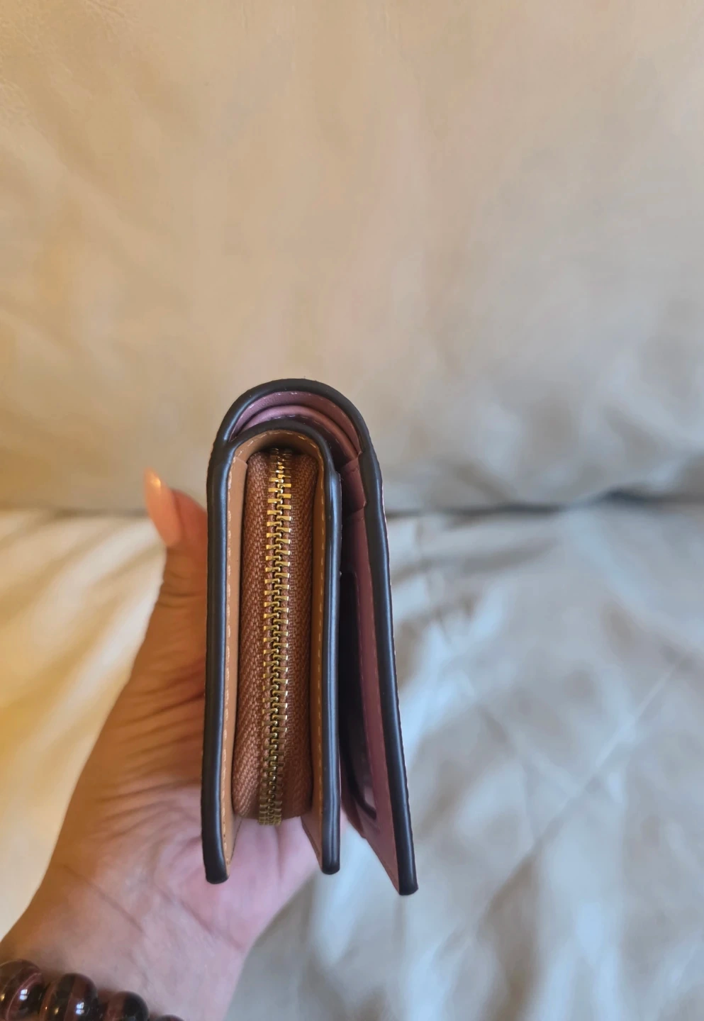 Outside zip coin pocket with 3 credit card slots. snap closure, full-length bill compartment, and ID window.