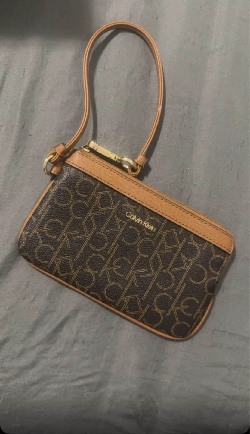 Selling a Calvin Klein wristlet in brown. It features the CK logo pattern. Great for carrying essentials!