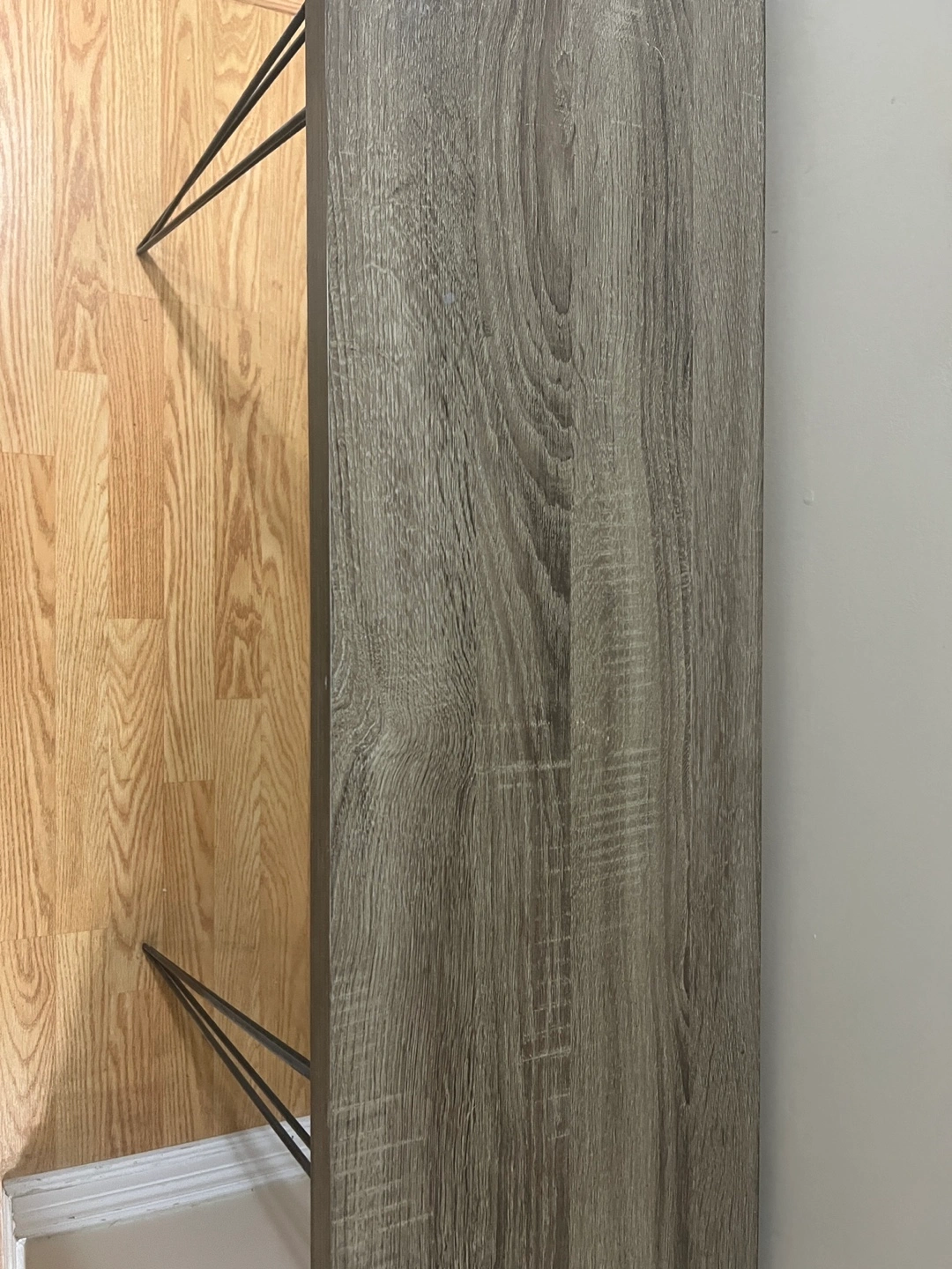 A sleek console table featuring a grey wood-look top and black hairpin legs. It's a great size for hallways or small spaces! This table is made of manufactured wood and metal.