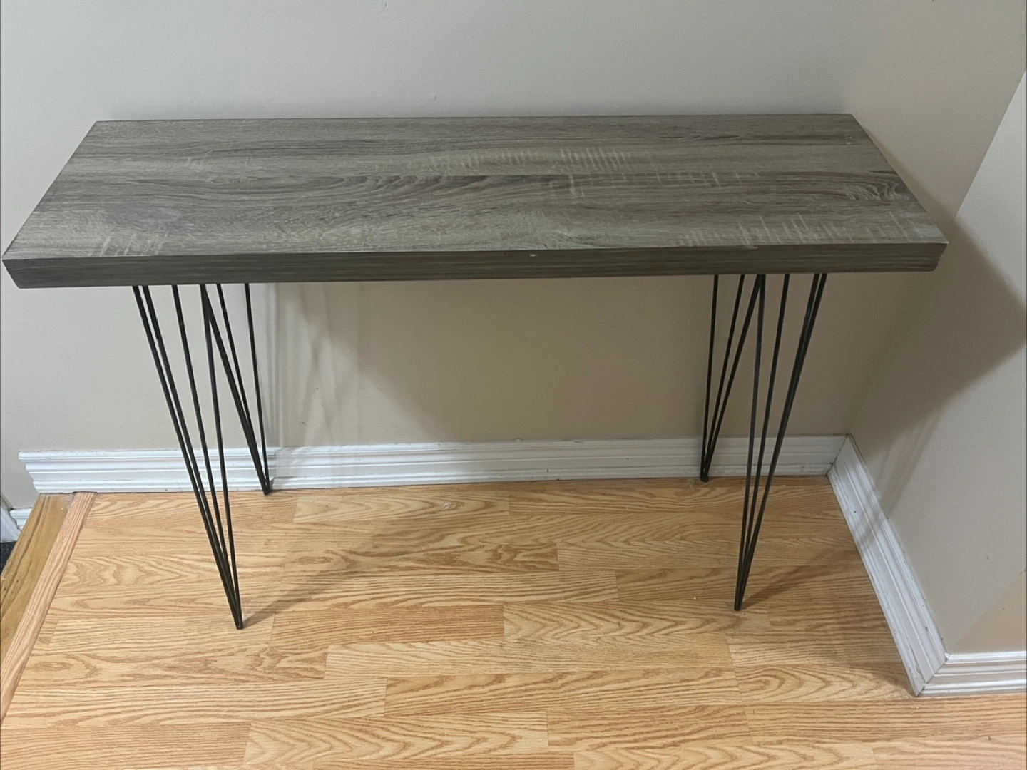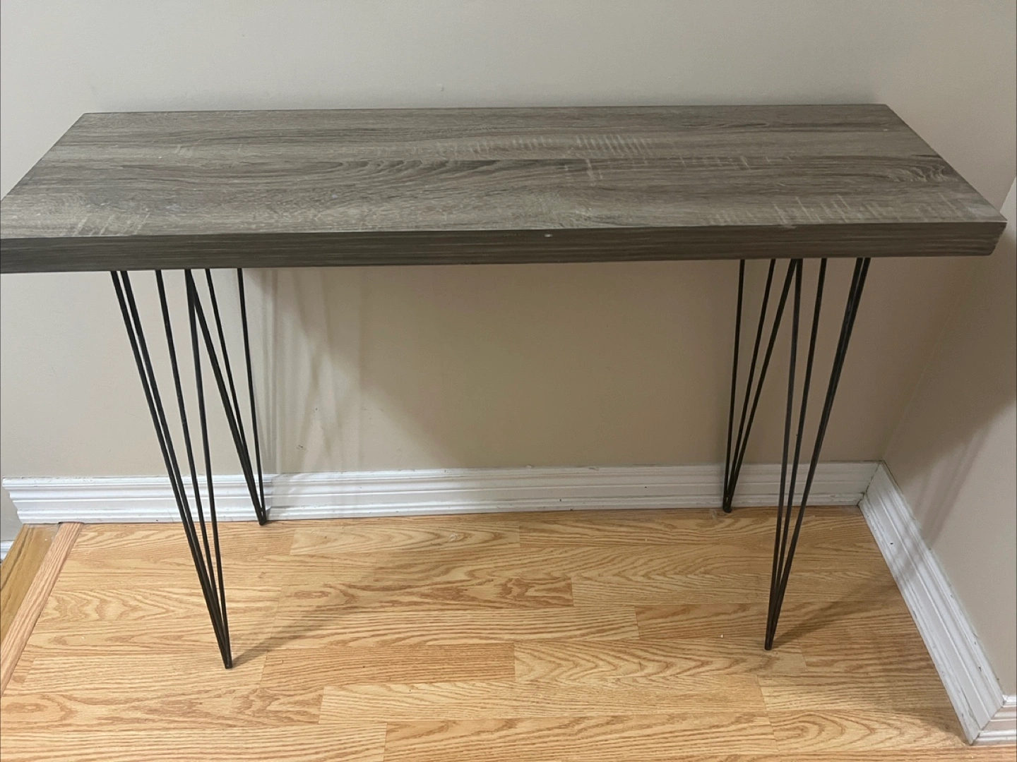 A sleek console table featuring a grey wood-look top and black hairpin legs. It's a great size for hallways or small spaces! This table is made of manufactured wood and metal.