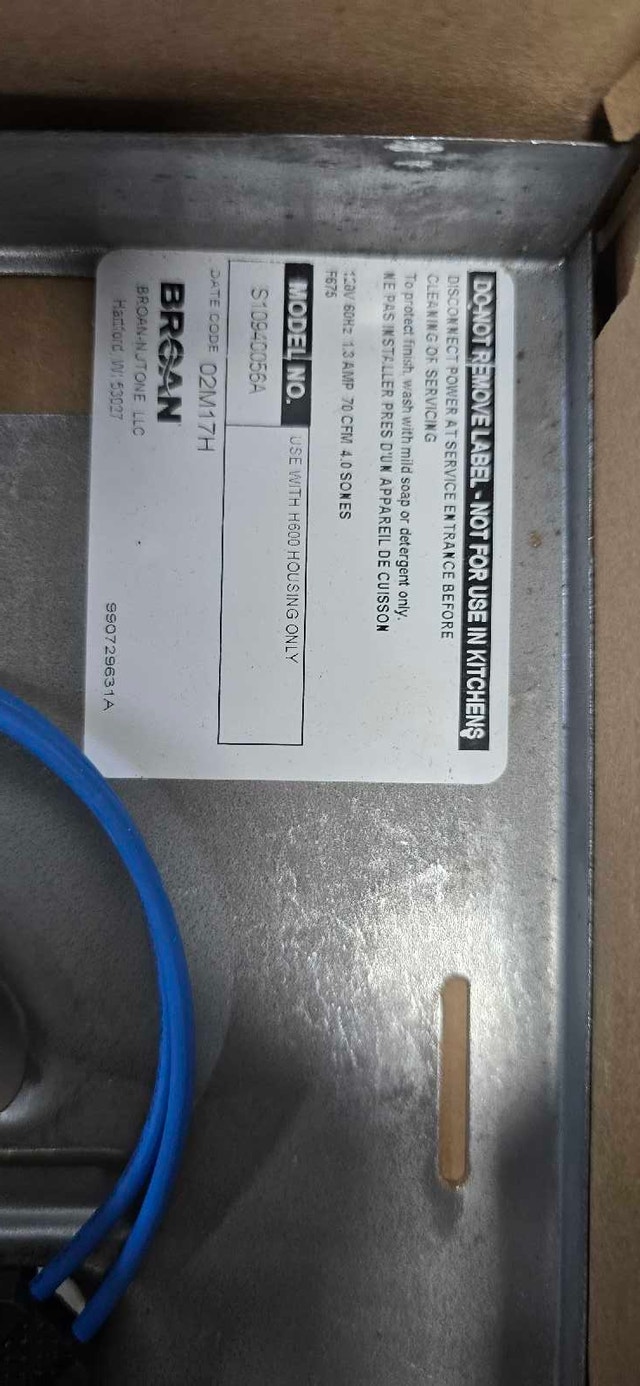 I am selling a brand-new Broan ventilation fan, model number S10546355BA. It has never been installed and is still in its original packaging. This fan ensures top quality and performance for your ventilation needs. Specifications: Model Number: S10546355BA. Date Code: 02M17H. If the ad is still up, the fan is available and ready to whisk away moisture and odours. Cash accepted.