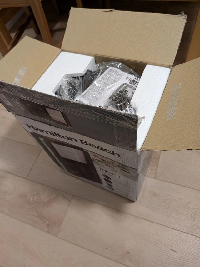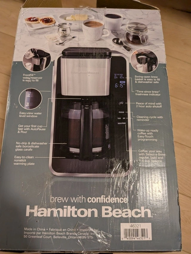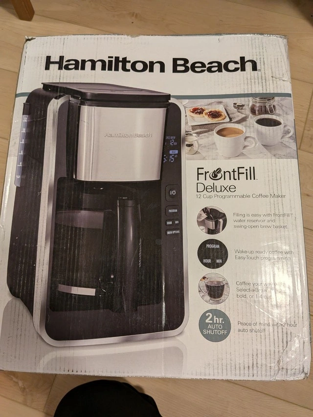 Enjoy the perfect cup of coffee with this easy-to-use Hamilton Beach Front-Fill Deluxe coffee maker. Its compact design is perfect for small kitchens, and the front-fill water reservoir makes it a breeze to use under cabinets. Brand: Hamilton Beach (Model 46321) Dimensions: 27.9D x 22W x 38.9H cm Features: * FrontFill™: Water reservoir and swing-open brew basket for easy access. Programmable: "Easy-Touch" programming to have coffee ready when you wake up. Customizable: Select-a-Brew options (Regular, Bold, or 1-4 cups). Safety: 2-hour automatic shut-off and a "Time Since Brew" freshness indicator. Our Price: $50 Condition: Slightly used (only a few times), very clean and in original box. Regular Price: $95.97 + tax. Cash accepted. Owner selling.
