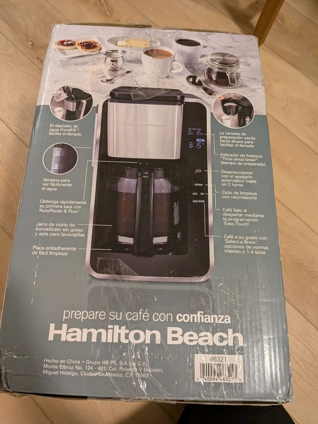 Enjoy the perfect cup of coffee with this easy-to-use Hamilton Beach Front-Fill Deluxe coffee maker. Its compact design is perfect for small kitchens, and the front-fill water reservoir makes it a breeze to use under cabinets. Brand: Hamilton Beach (Model 46321) Dimensions: 27.9D x 22W x 38.9H cm Features: * FrontFill™: Water reservoir and swing-open brew basket for easy access. Programmable: "Easy-Touch" programming to have coffee ready when you wake up. Customizable: Select-a-Brew options (Regular, Bold, or 1-4 cups). Safety: 2-hour automatic shut-off and a "Time Since Brew" freshness indicator. Our Price: $50 Condition: Slightly used (only a few times), very clean and in original box. Regular Price: $95.97 + tax. Cash accepted. Owner selling.