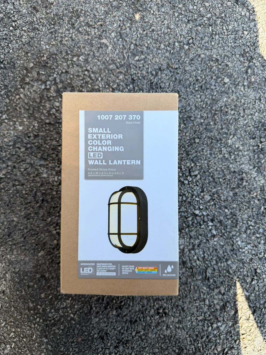 Small exterior LED wall lantern with a black finish. It features frosted stripe glass and an integrated switch to adjust the color of light. This fixture is wet location rated and has a maintenance-free design that lasts up to 3 years with 600 lumens. Dimensions are 4.8 in W x 8.3 in H x 3.6 in D.