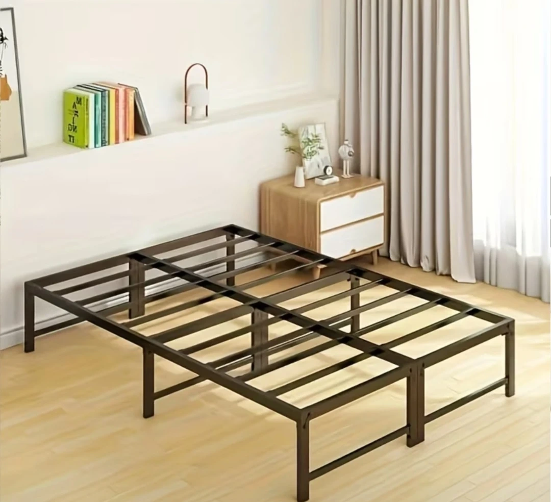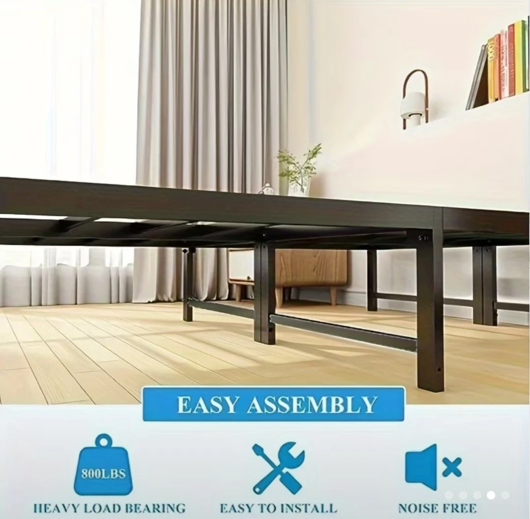 Selling a metal platform bed frame, perfect for a twin-sized mattress! The dimensions are approximately 76.7" x 55.5" and 13.7" high. It is easy to assemble and has a heavy load bearing capacity of 800lbs. This bed frame is also noise-free!