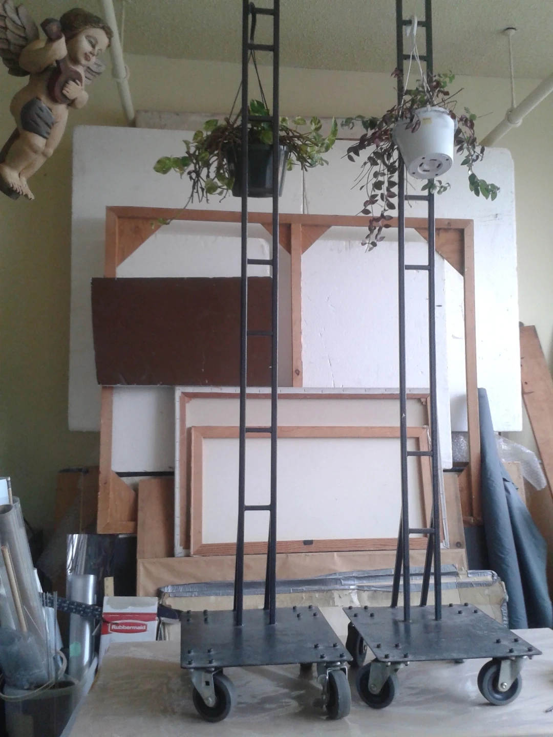 Two metal plant stands on casters. Each stand features a vertical support with rungs for hanging. These are great for displaying plants, especially in a studio or greenhouse setting! Sturdy construction.