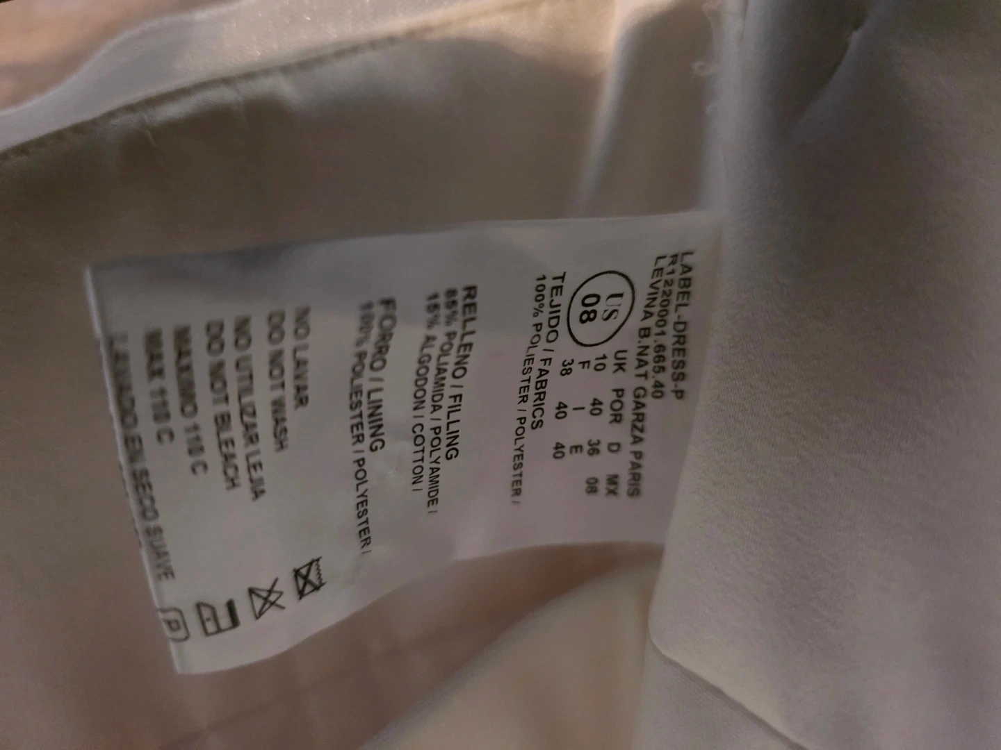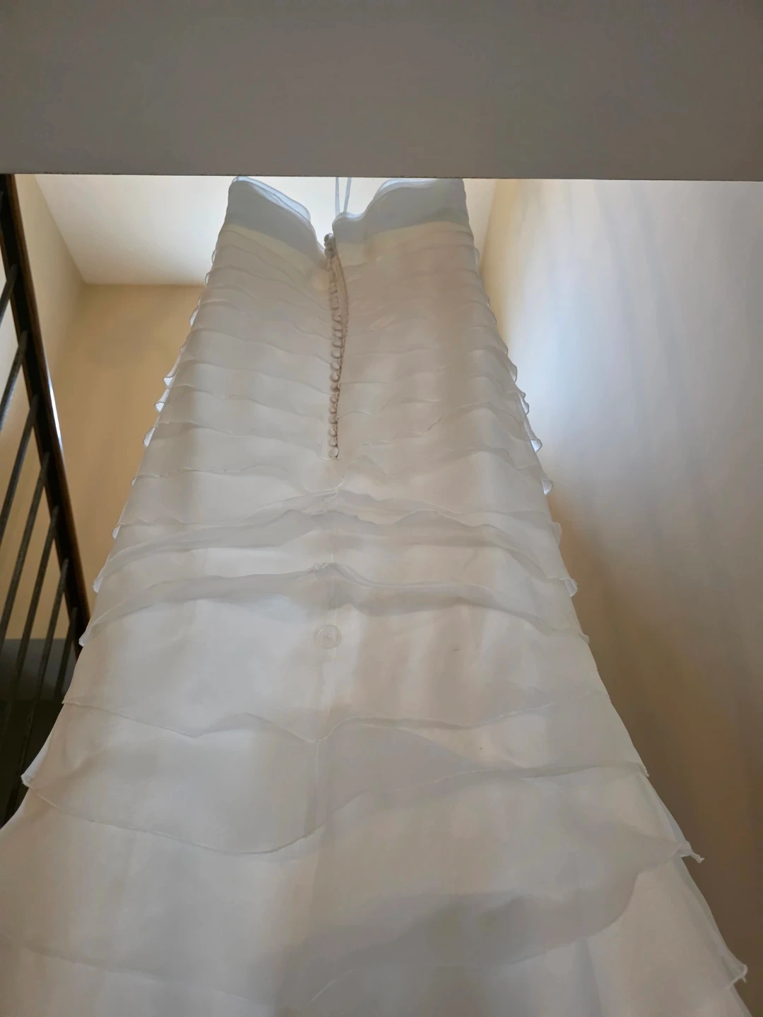 White strapless wedding dress with tiered ruffles. It's a size US 8, with a fabric blend of 100% polyester. This gown has a beautiful layered skirt.
