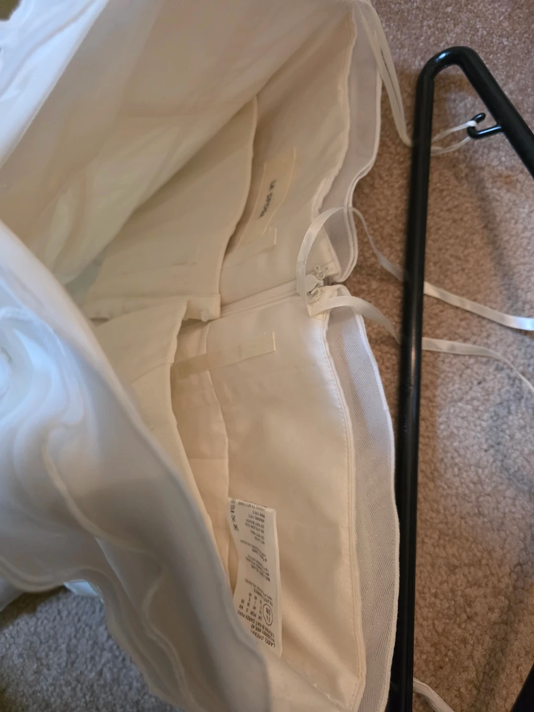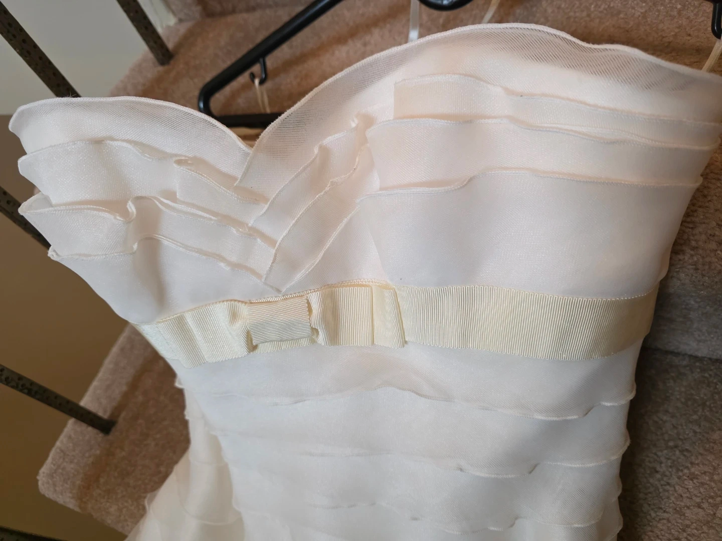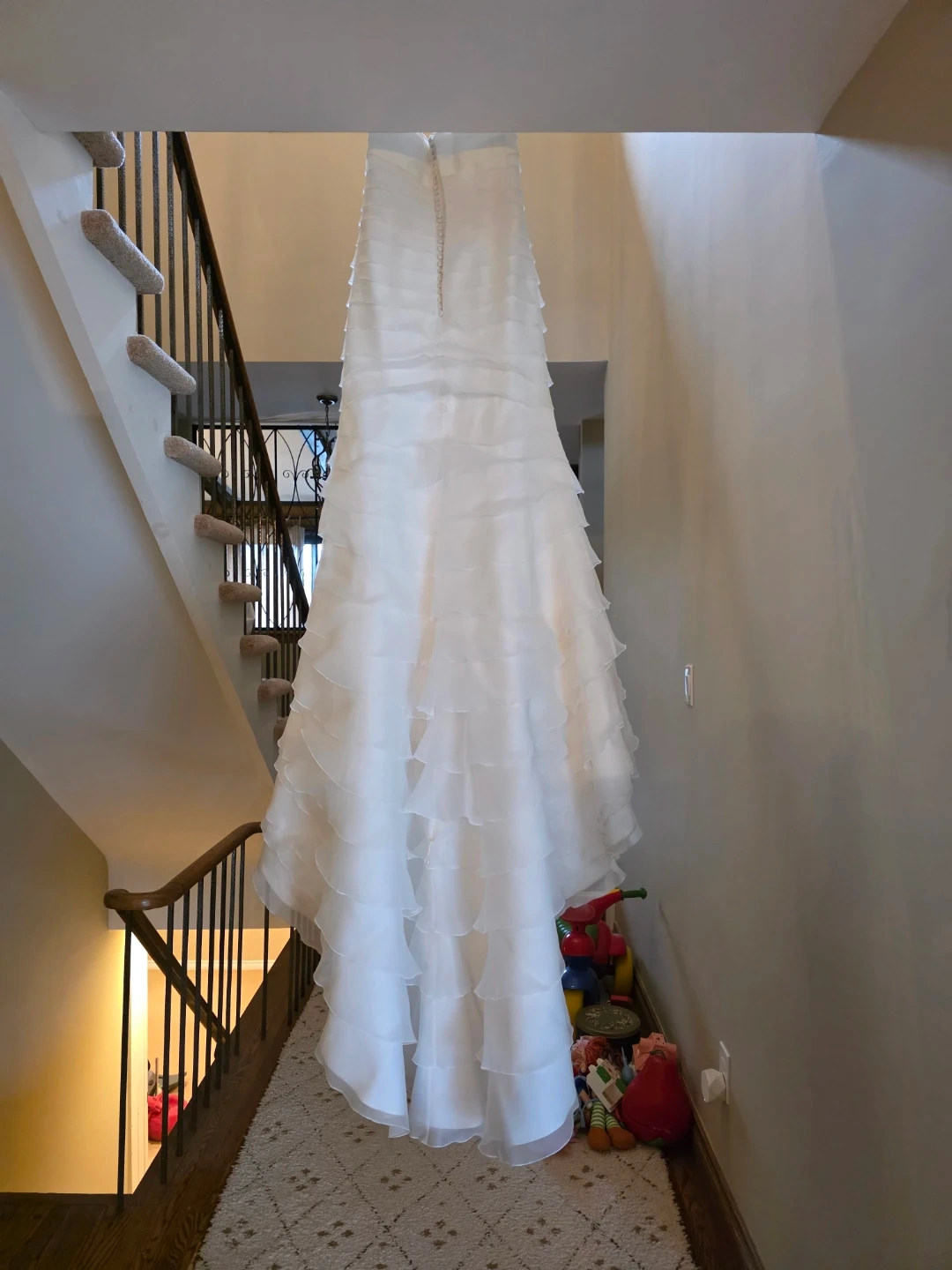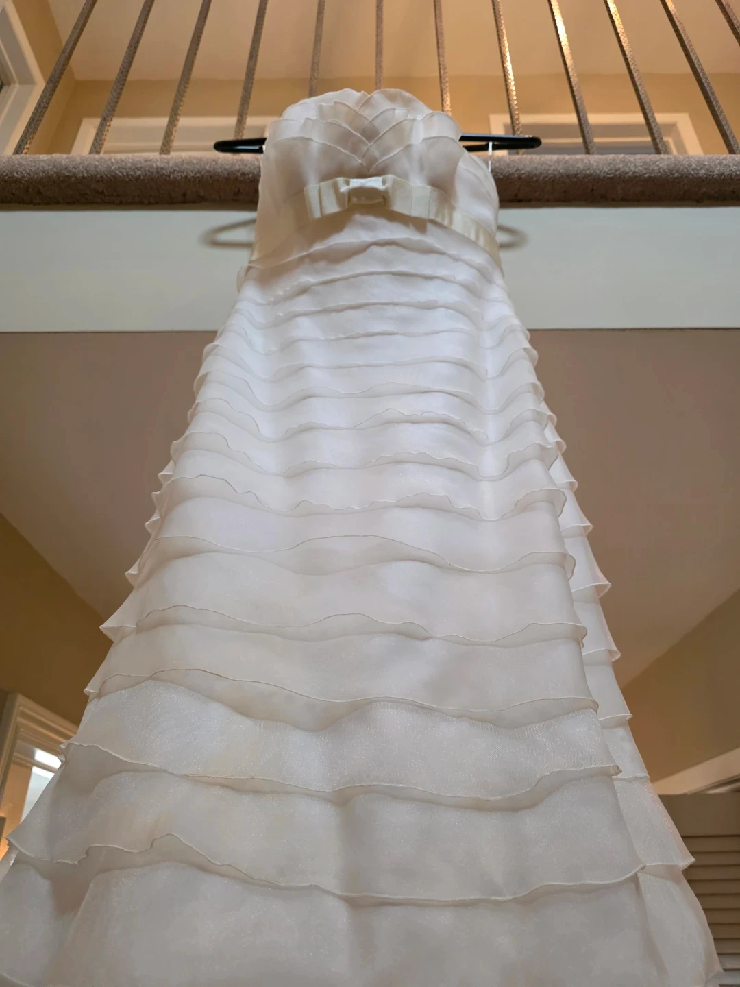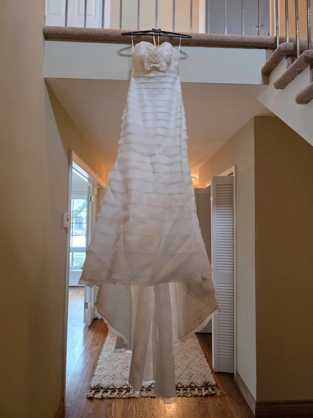 White strapless wedding dress with tiered ruffles. It's a size US 8, with a fabric blend of 100% polyester. This gown has a beautiful layered skirt.