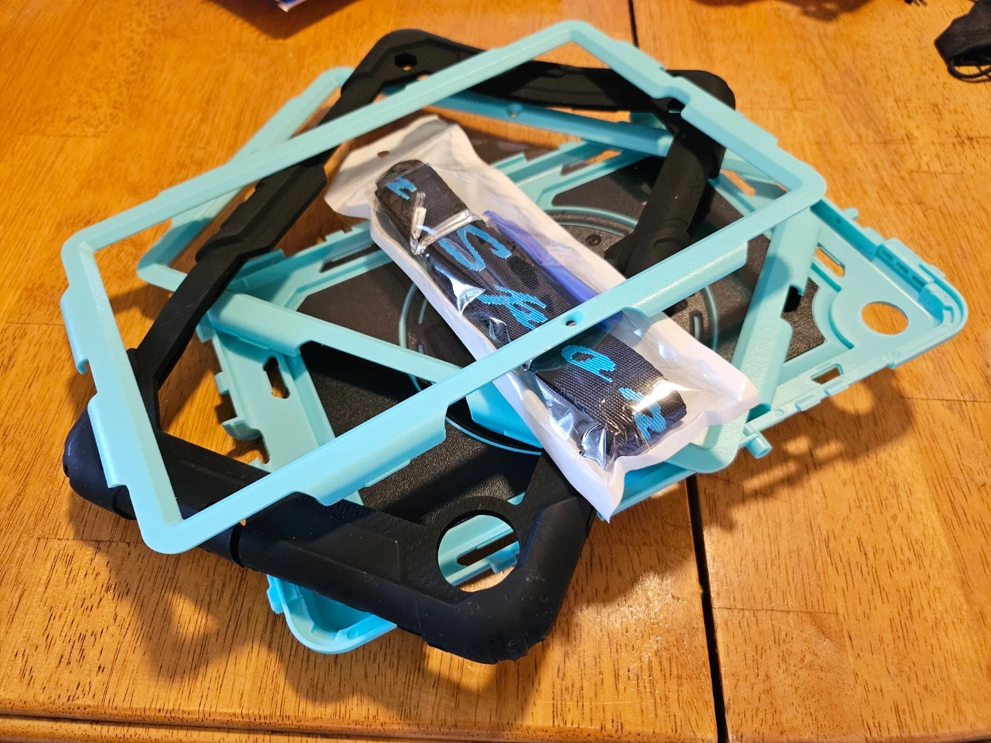 Fully enclosed case with screen protector, pencil holder, and a 360 rotating hand strap and stand. Designed for the 10.4" version of the Galaxy Tab S6 Lite (2024/2022/2020). Does not come with pencil. Check page for compatible tablet availability. Was wiped down quickly.