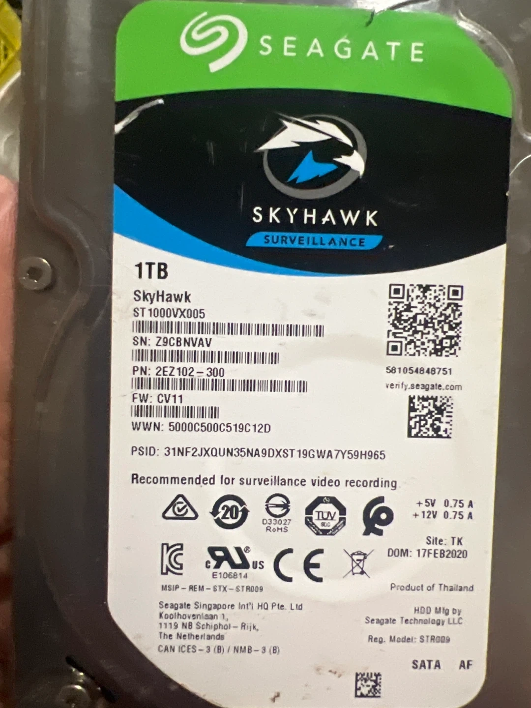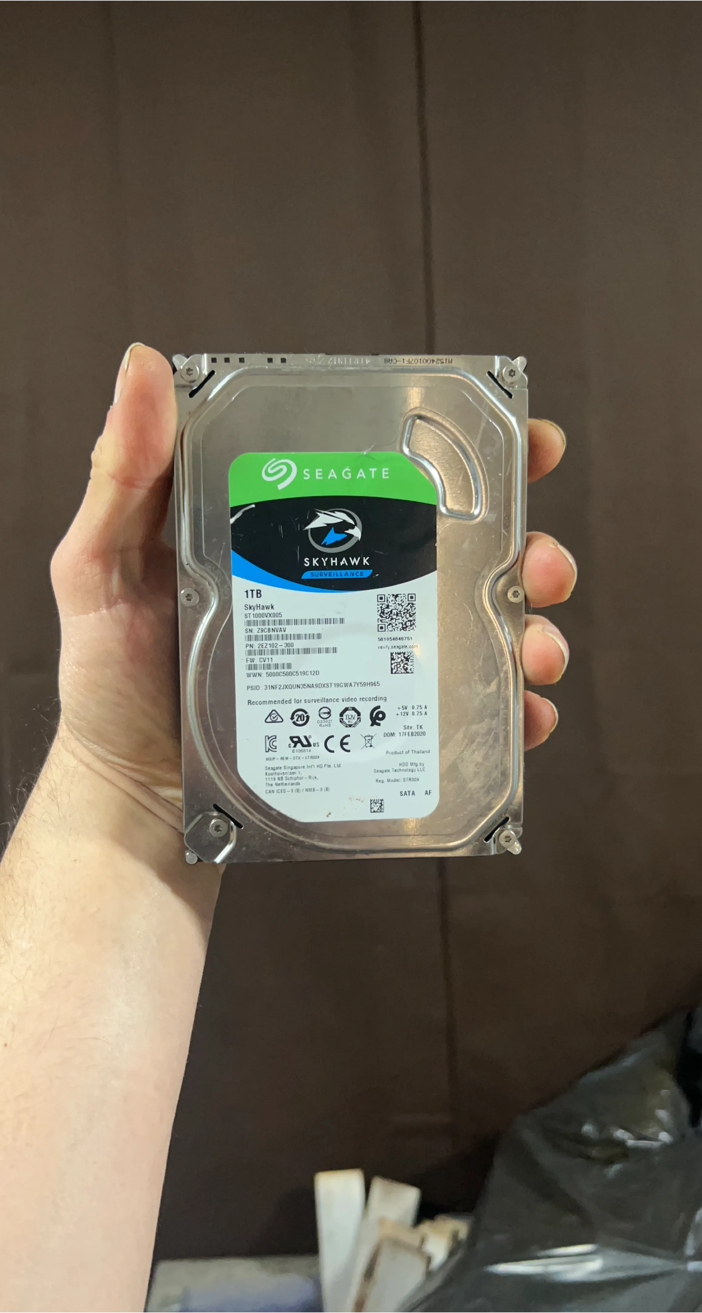 This is a Seagate SkyHawk 1TB internal hard drive. It's recommended for surveillance. SATA interface.