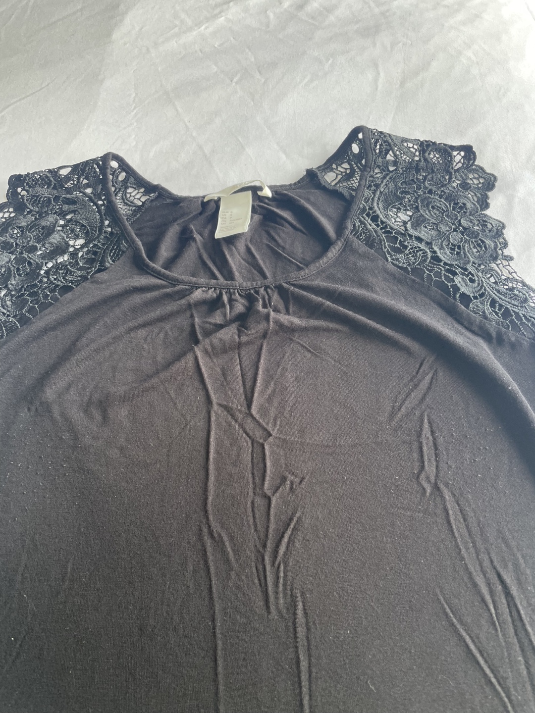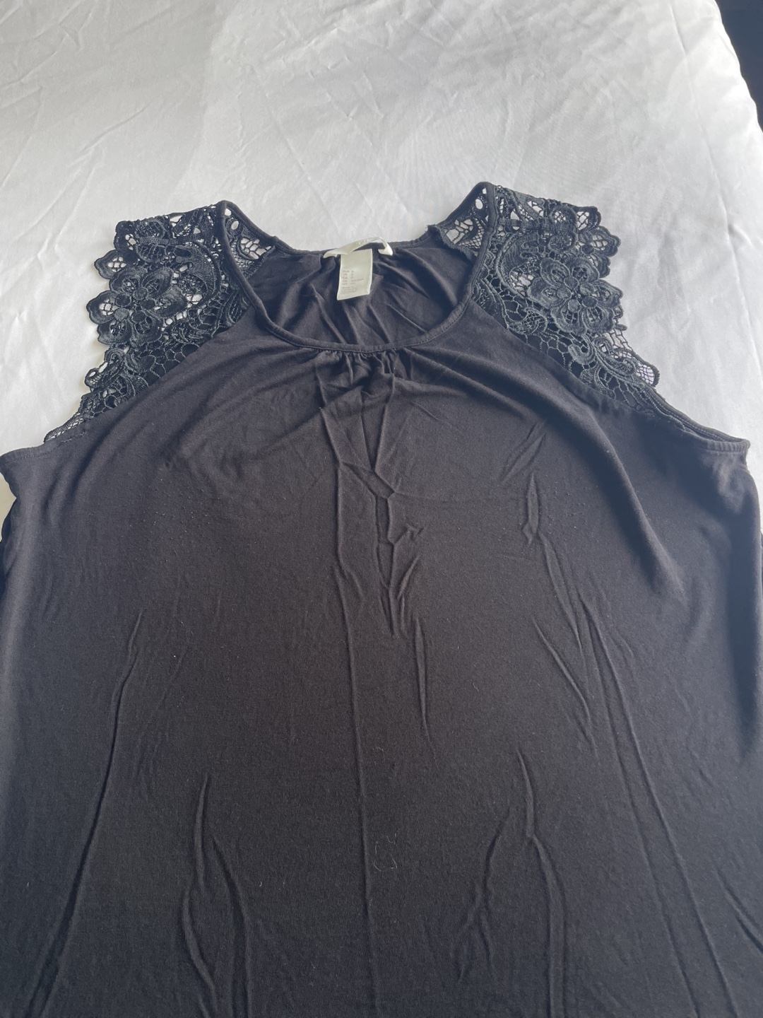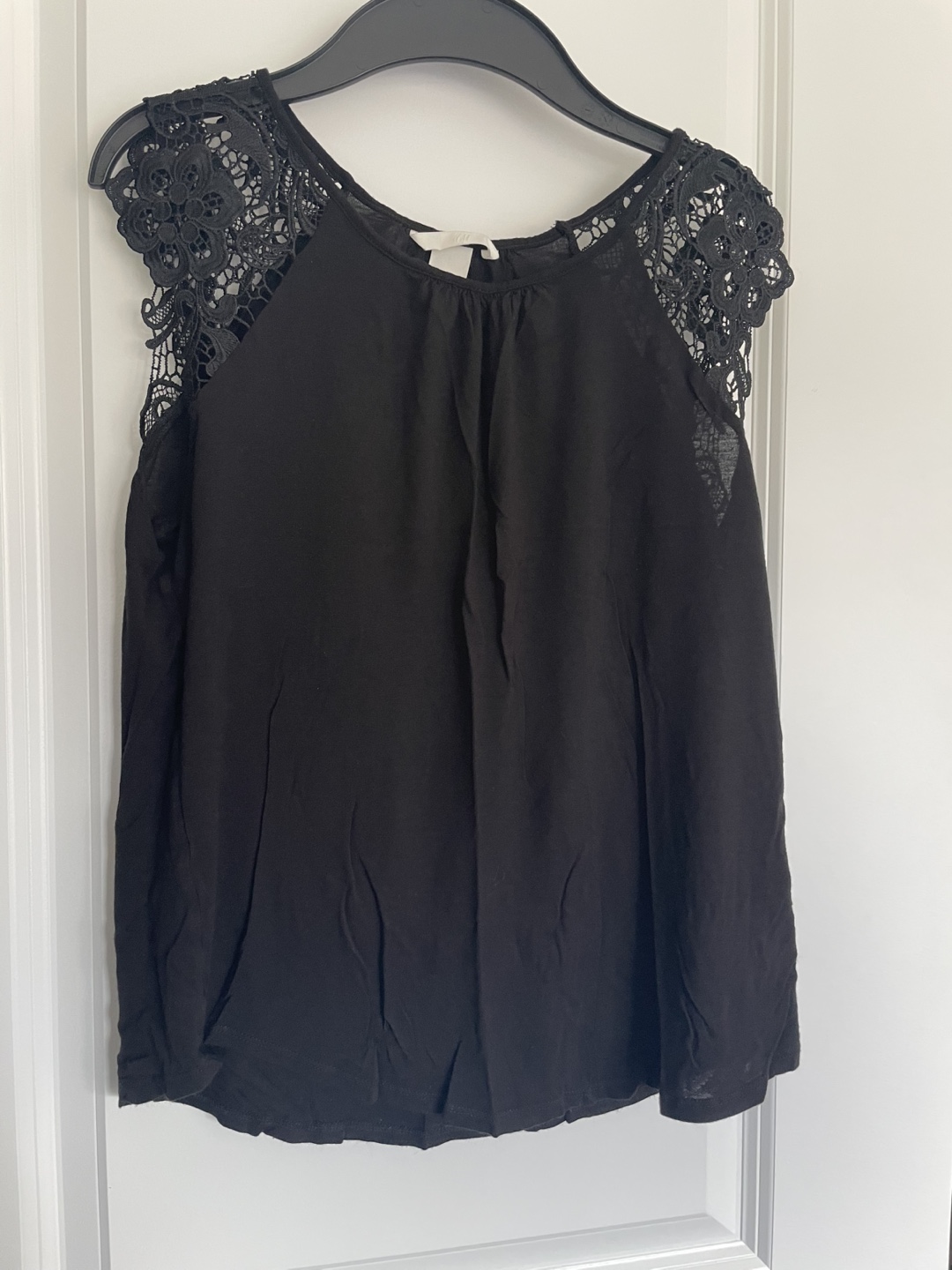 Women's black sleeveless top. Features delicate black lace detailing on the shoulders. Simple, elegant design. Great for layering or wearing on its own.
