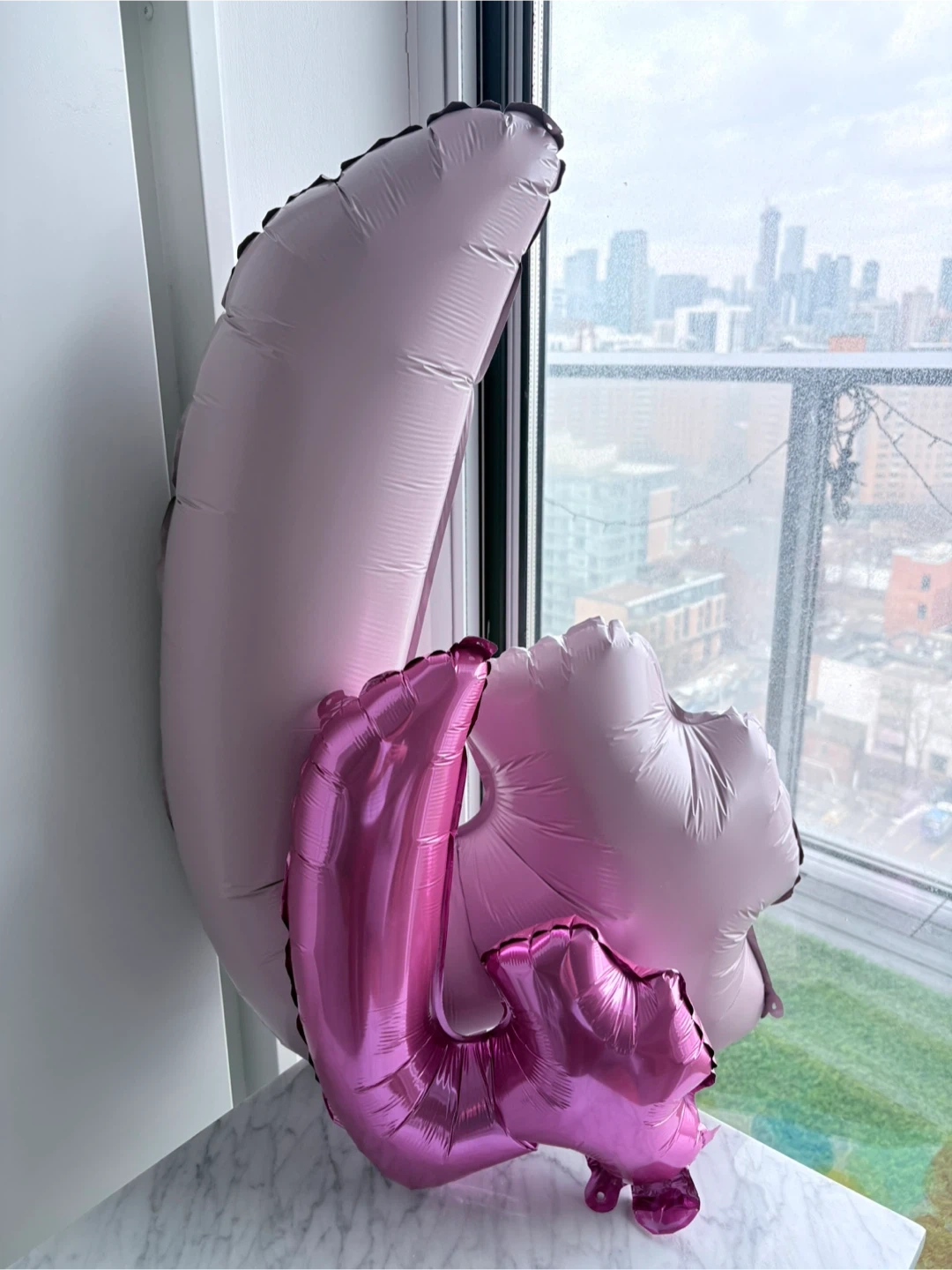 Two pink foil balloons shaped like the number 4 - one small dark pink and large light pink. They are perfect for birthdays or anniversaries. They are made of Mylar material and come inflated.