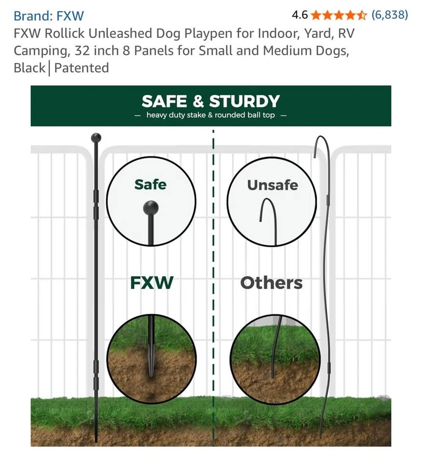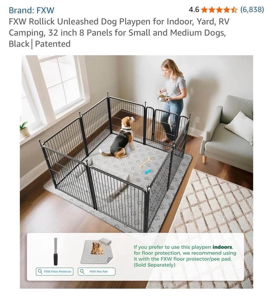 This FXW dog playpen offers a spacious and safe area for your small to medium-sized dog, both indoors and outdoors. It's made of durable black metal and sets up in under 5 minutes. The panels are connectable and can be arranged in various shapes. The stakes have rounded tops to protect your dog's paws, and the door features a secure locking mechanism. Great for use in the yard, for RV camping, or traveling. When using indoors, consider placing it on a rug or mat to protect your floors.