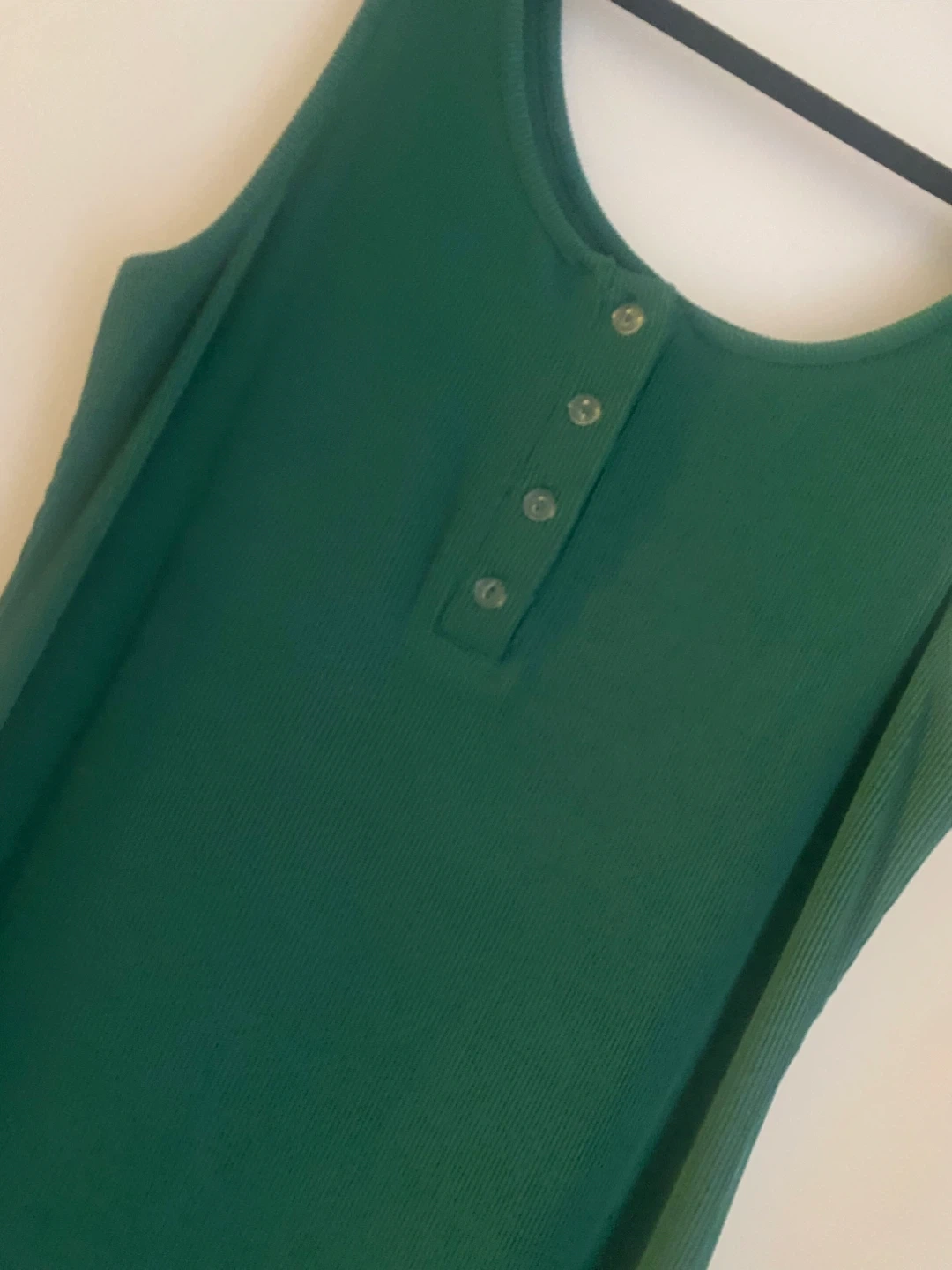 This green ribbed tank dress features a henley neckline with three buttons. It's a sleeveless, midi-length style. Fabric is stretchy and comfortable.
