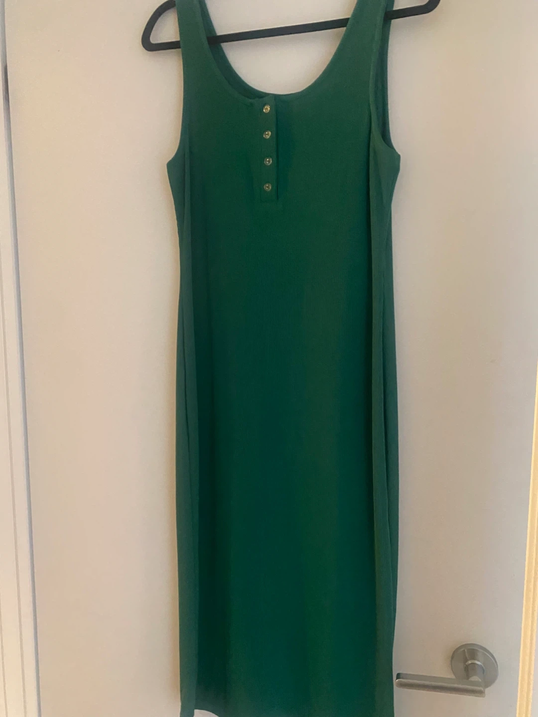 This green ribbed tank dress features a henley neckline with three buttons. It's a sleeveless, midi-length style. Fabric is stretchy and comfortable.