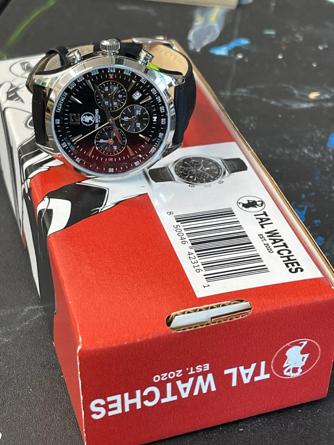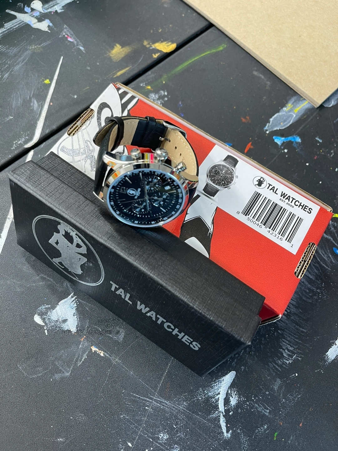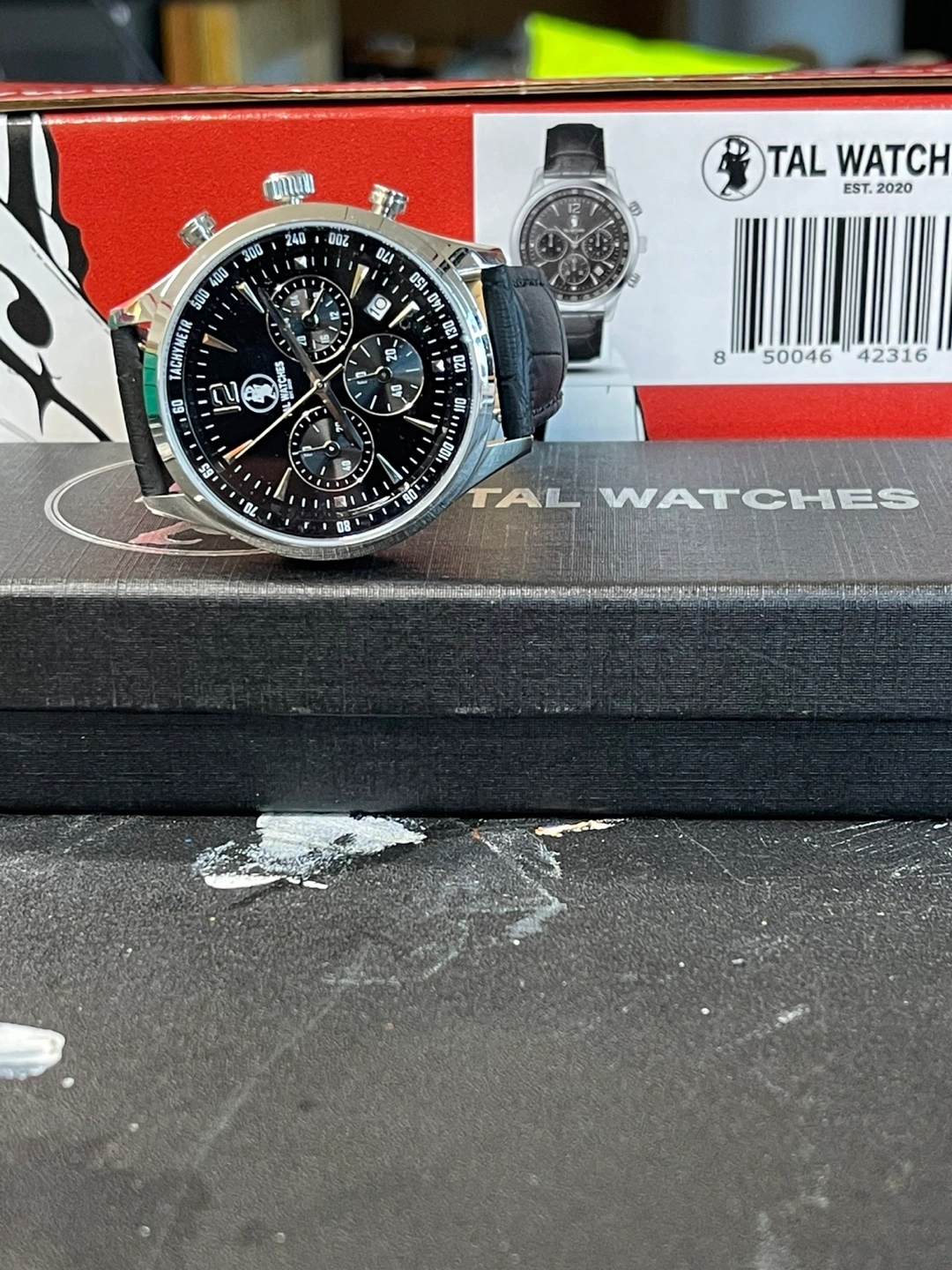 Selling a TAL Watches chronograph watch. It comes with the original box. The watch features a black leather strap and a stainless steel case. The dial is black with multiple subdials and a tachymeter scale around the edge. It's in great condition!