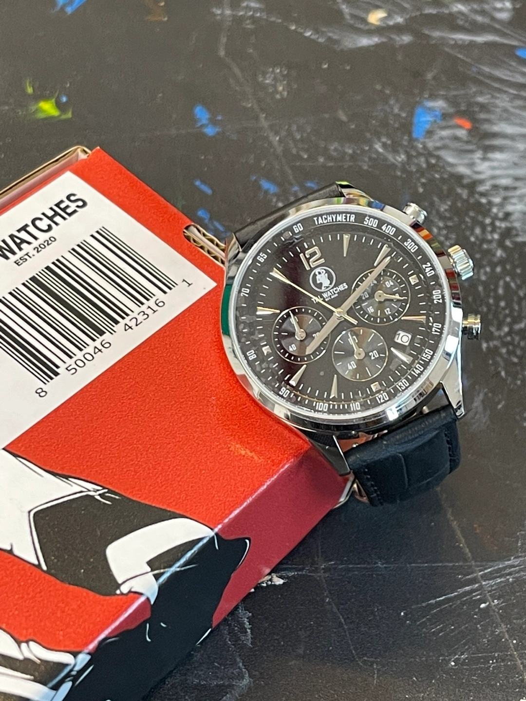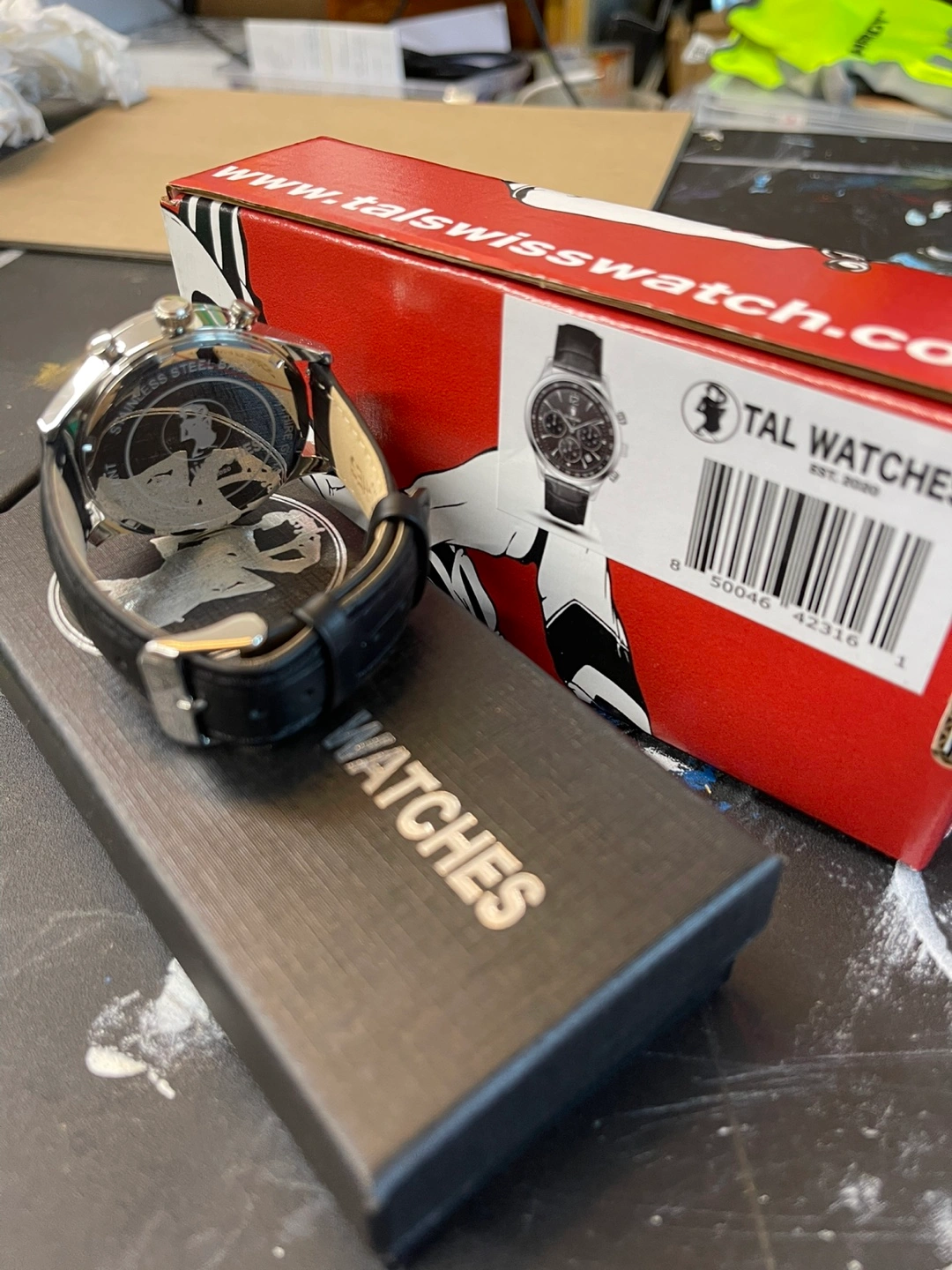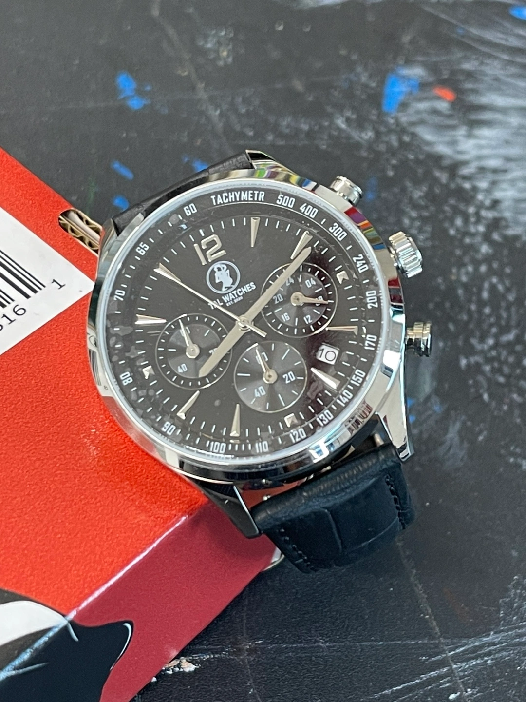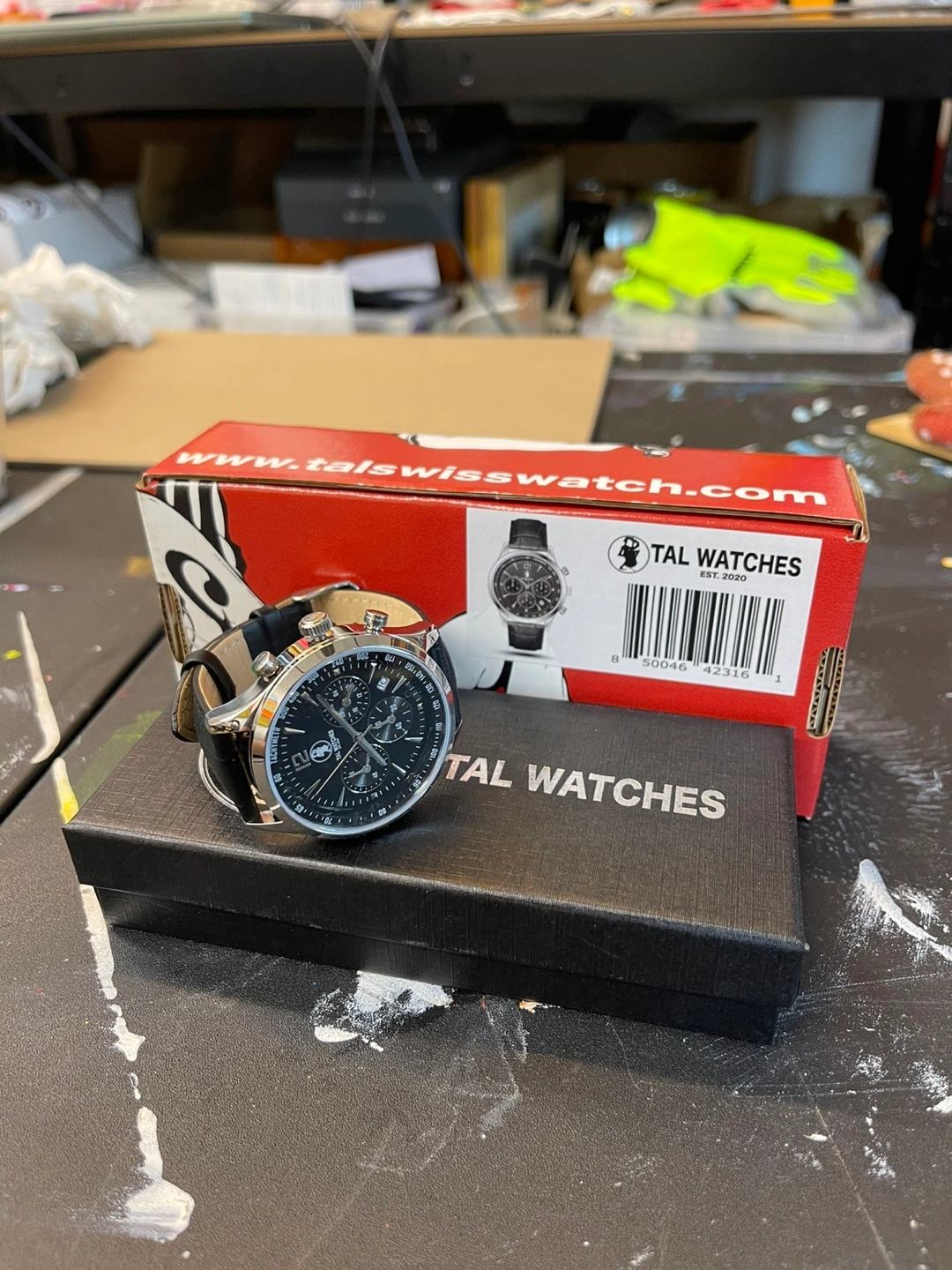 Selling a TAL Watches chronograph watch. It comes with the original box. The watch features a black leather strap and a stainless steel case. The dial is black with multiple subdials and a tachymeter scale around the edge. It's in great condition!