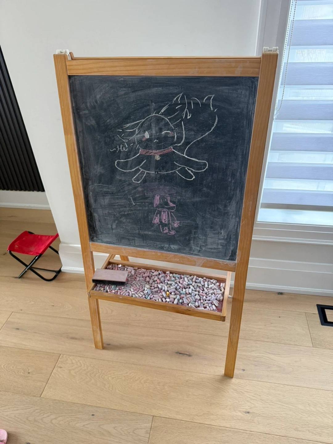 Double-sided easel chalkboard with a wooden frame. It comes with a tray filled with assorted chalk. Great for kids' art projects!