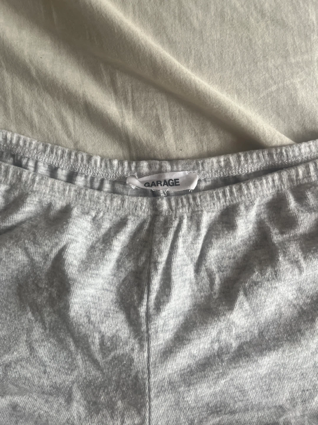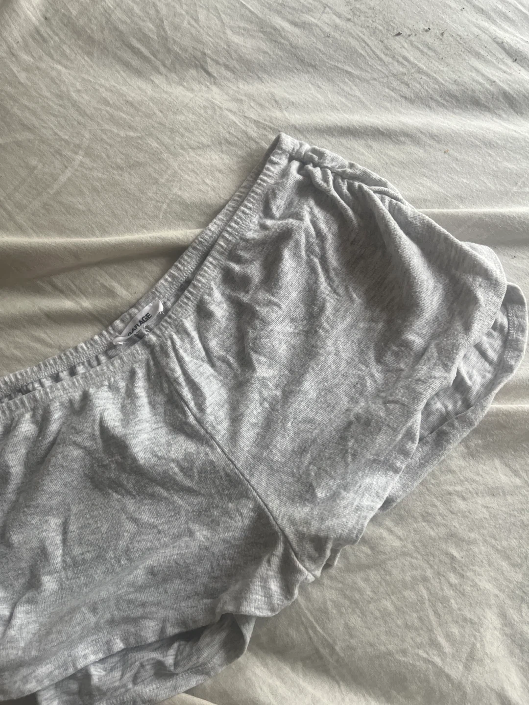 These grey lounge shorts are from Garage. They're made of a soft cotton blend and feature an elastic waistband with ruched sides. Perfect for relaxing at home!