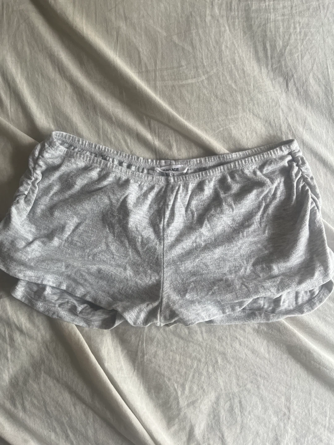 These grey lounge shorts are from Garage. They're made of a soft cotton blend and feature an elastic waistband with ruched sides. Perfect for relaxing at home!