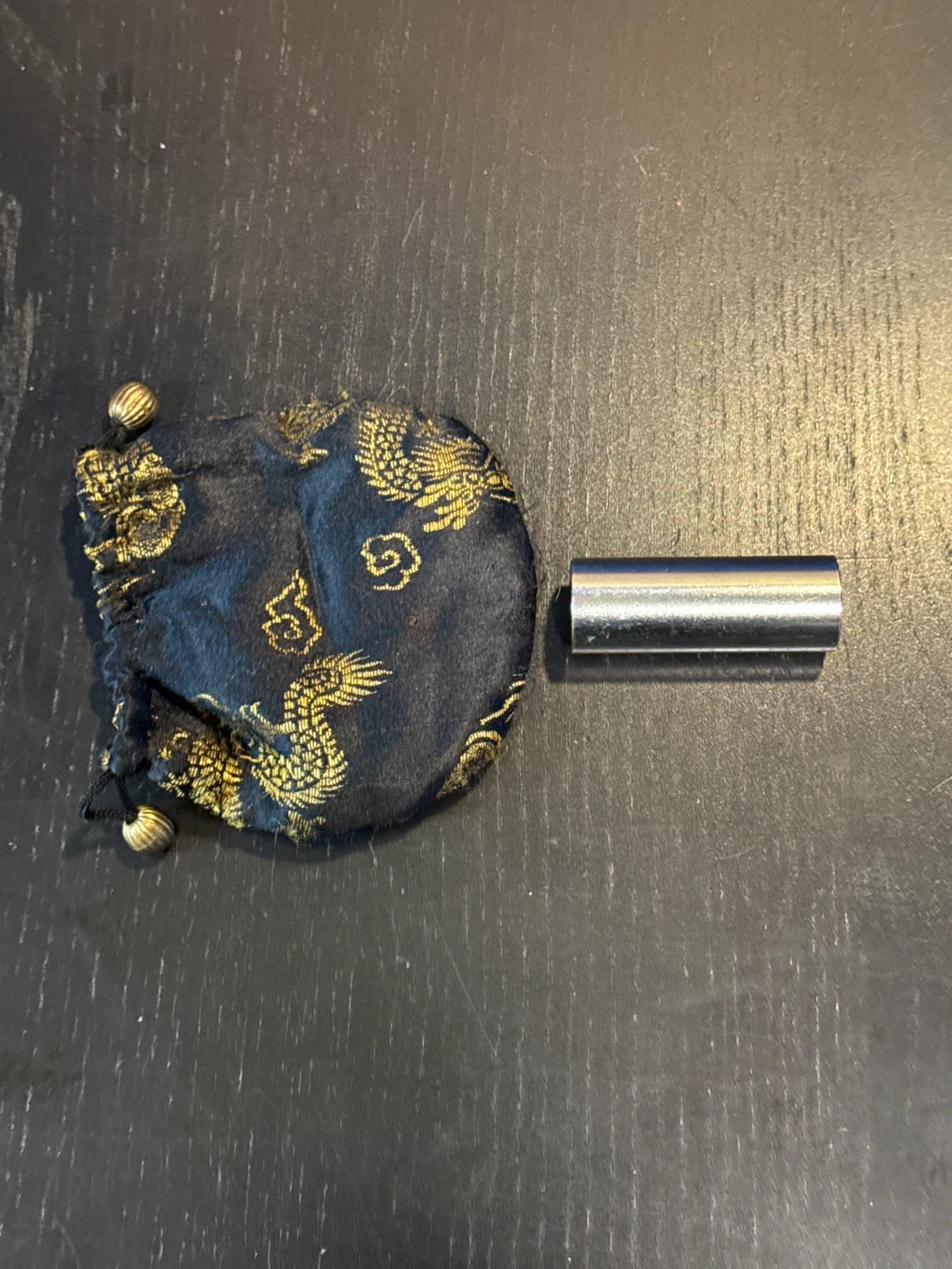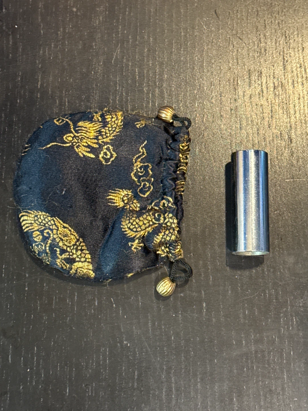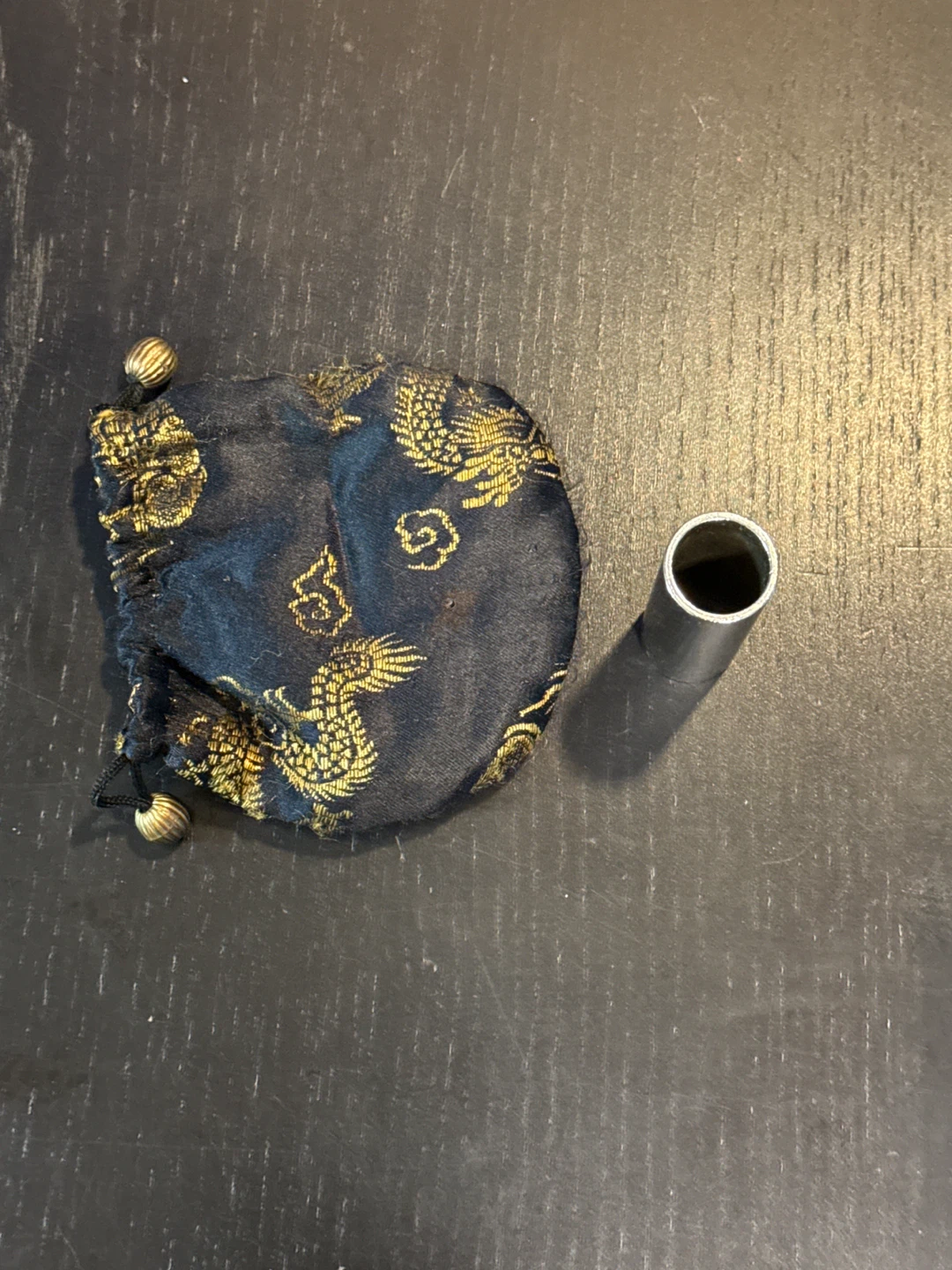 Selling a metal guitar slide with a decorative dragon print pouch. Perfect for adding a bluesy tone to your music. The slide is made of smooth, durable metal.