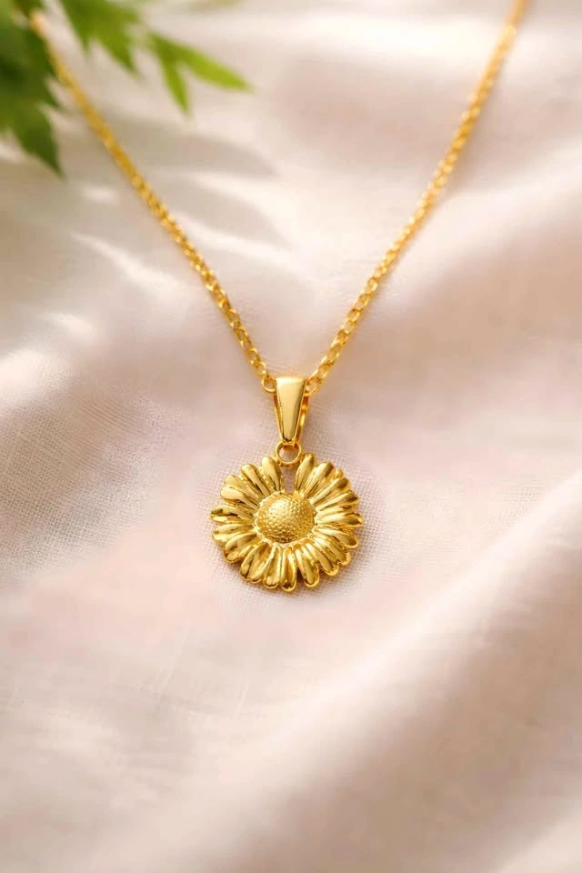 Shiny gold-plated necklace with a pretty sunflower pendant. Stainless steel with 18k gold plating. Great for everyday wear or a gift.